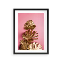 Plakat w ramie 50x70 - Złote Liście Monstery: Delikatność na Różowym Tle