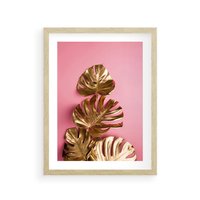 Plakat w ramie 40x50 - Złote Liście Monstery: Delikatność na Różowym Tle
