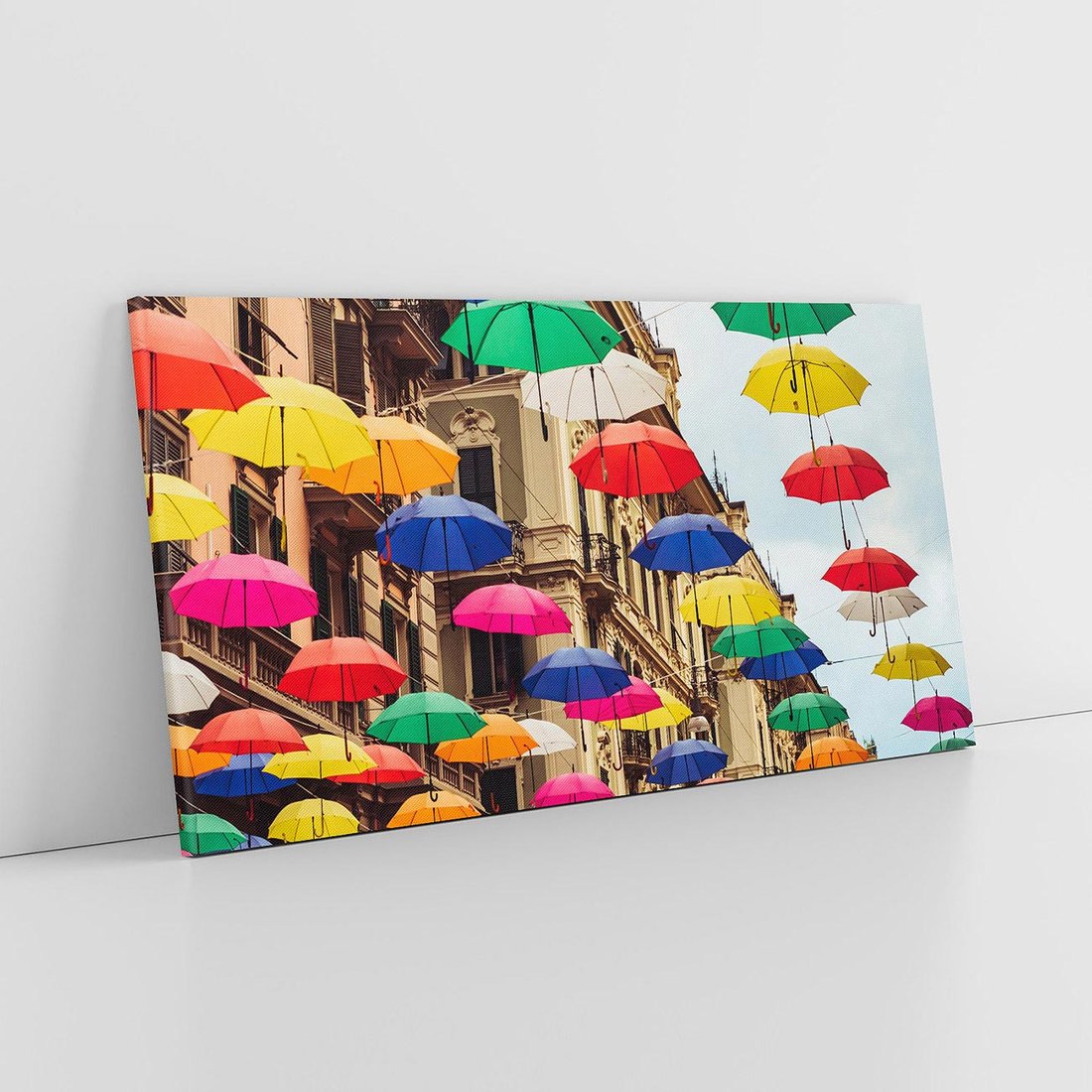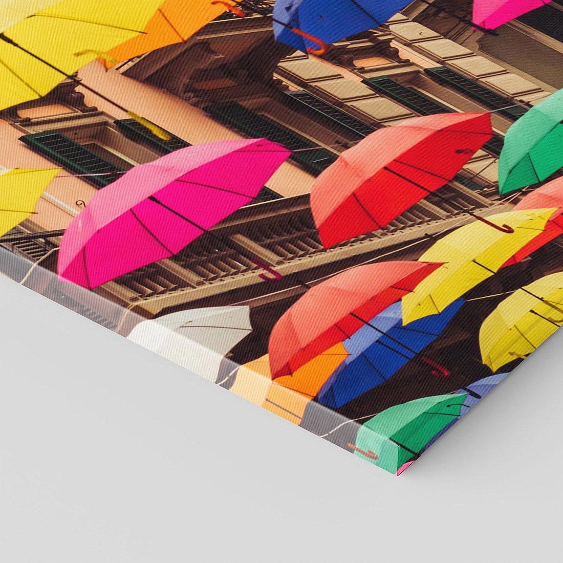 Fotografia ukazująca radosną scenę ulicy, gdzie kolorowe parasolki unoszą się nad głowami przechodniów. Ta tęczowa eksplozja kolorów tworzy niezapomnianą atmosferę, wprowadzając radość i życie do Twojego wnętrza. Te zatrzymane w kadrze chwile przypomną Ci o urokach codziennego życia.