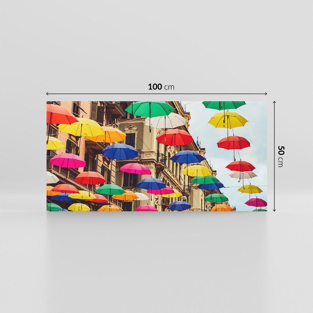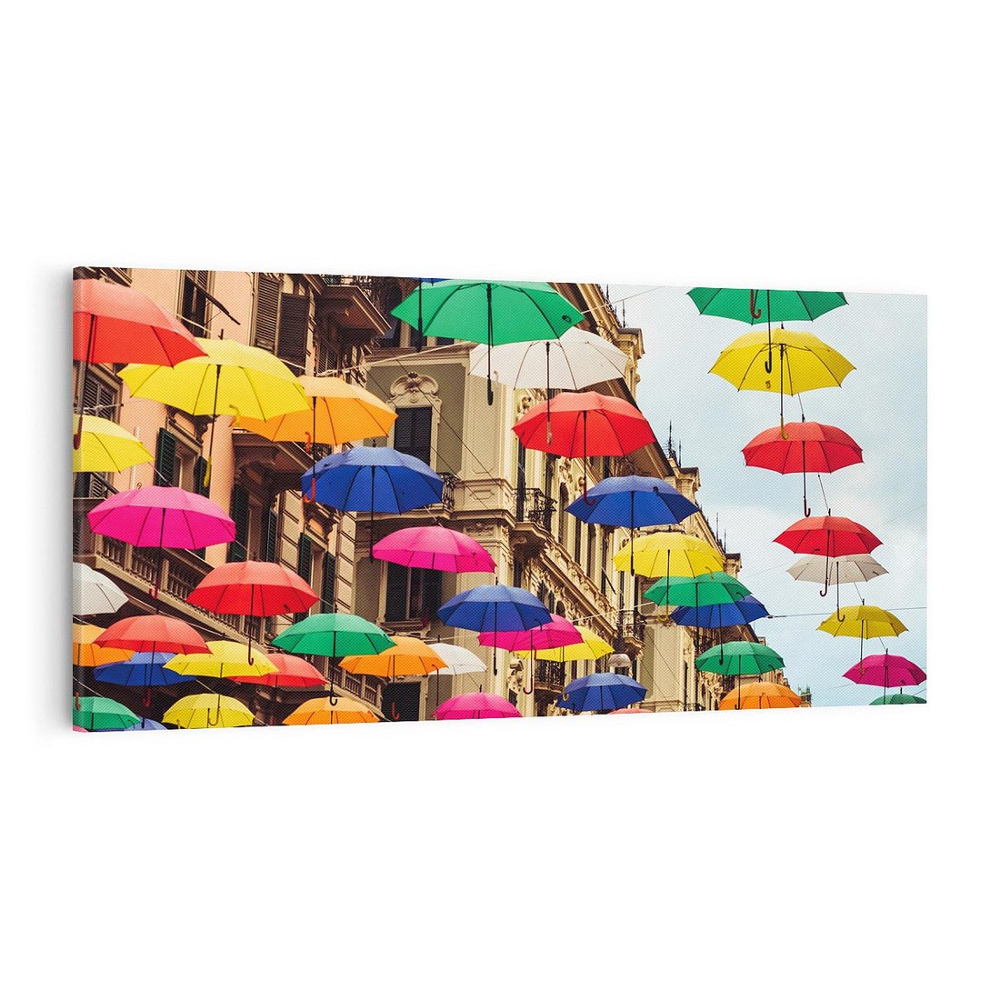Obraz na płótnie 100x50 - Barwna symfonia wyobraźni - fotografia, kolorowe parasolki podwieszone nad ulicą