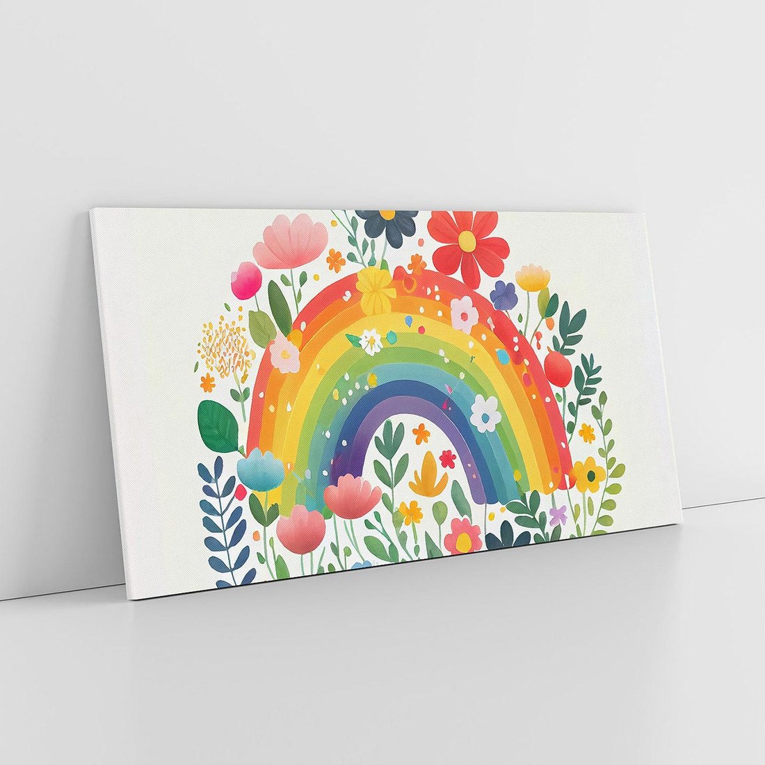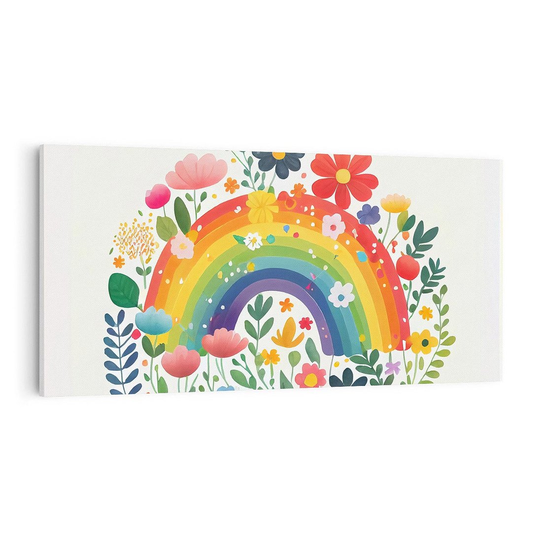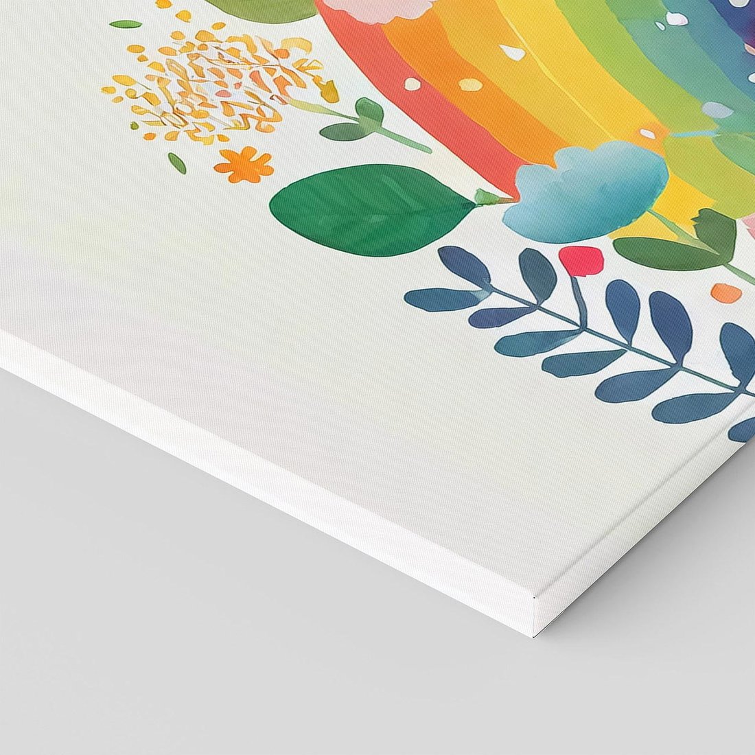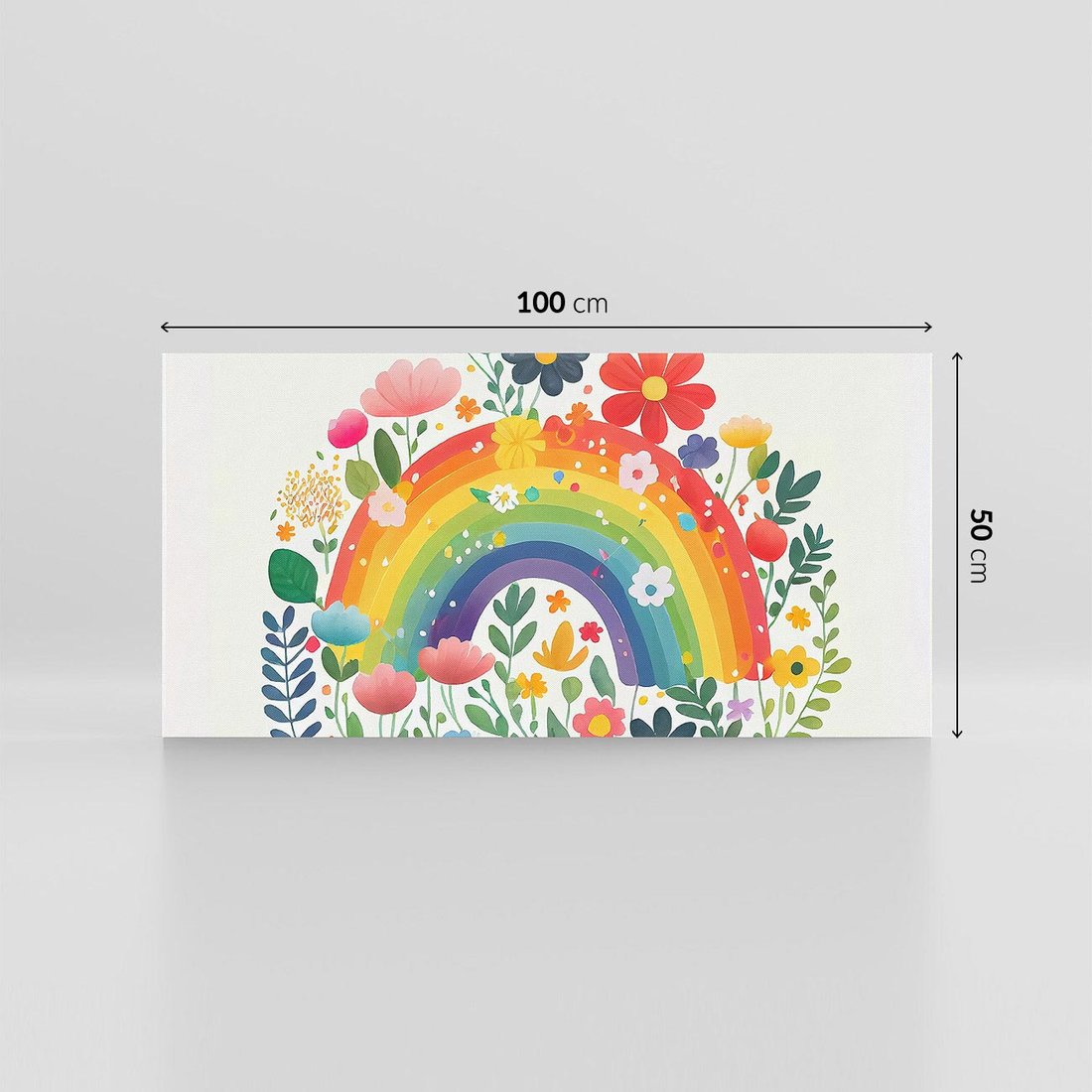 To urocze dzieło sztuki zostało stworzone z myślą o pokoju małej dziewczynki. Na obrazie widzimy kolorową tęczę, wykonaną w technice akwareli, na której rozkwitają piękne kwiaty o różnych odcieniach tęczowych kolorów. To pełne radości, kreatywności i magii dzieło, które ożywi przestrzeń i przyniesie do pokoju dziecka pozytywną energię.