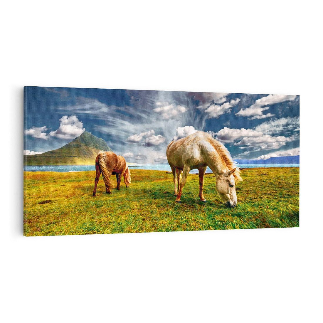 - Obraz na płótnie 100x50 - Konie na łące przy jeziorze: Siła natury