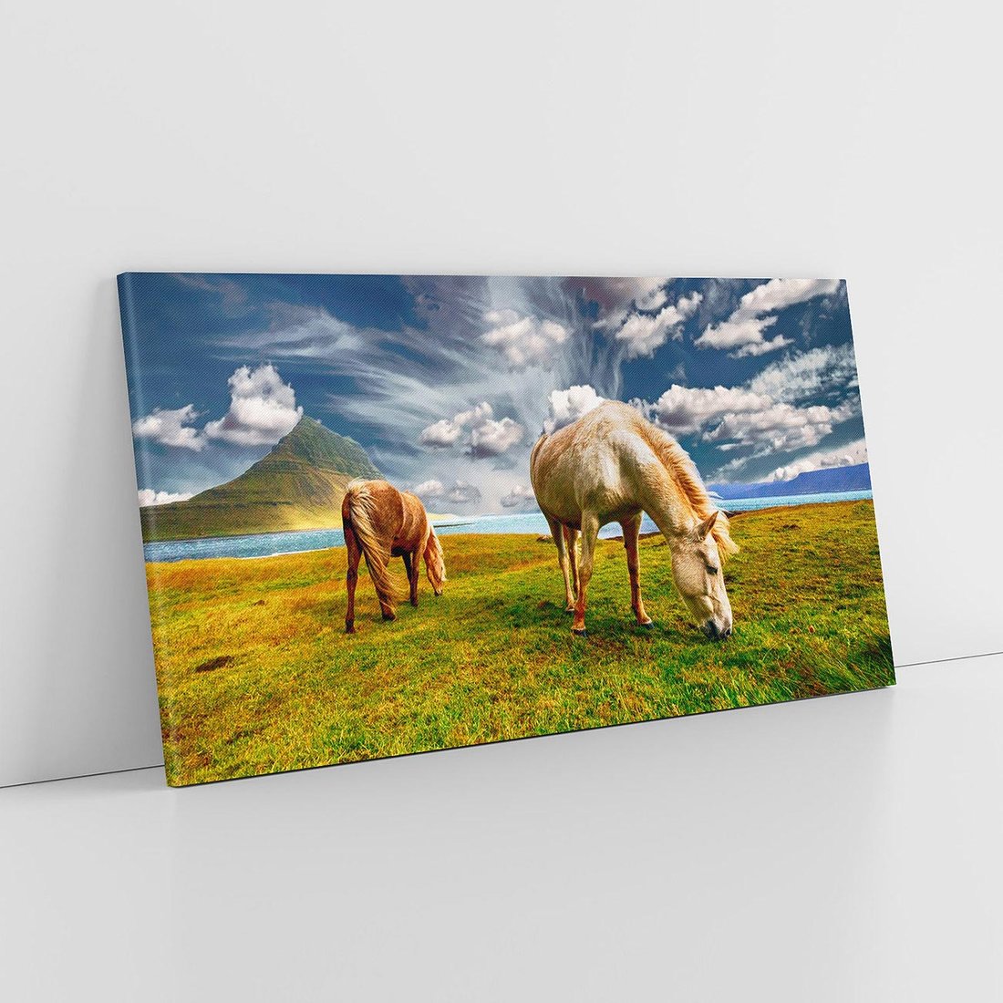 Obraz na płótnie 100x50 - Konie na łące przy jeziorze: Siła natury - konie, łąka
