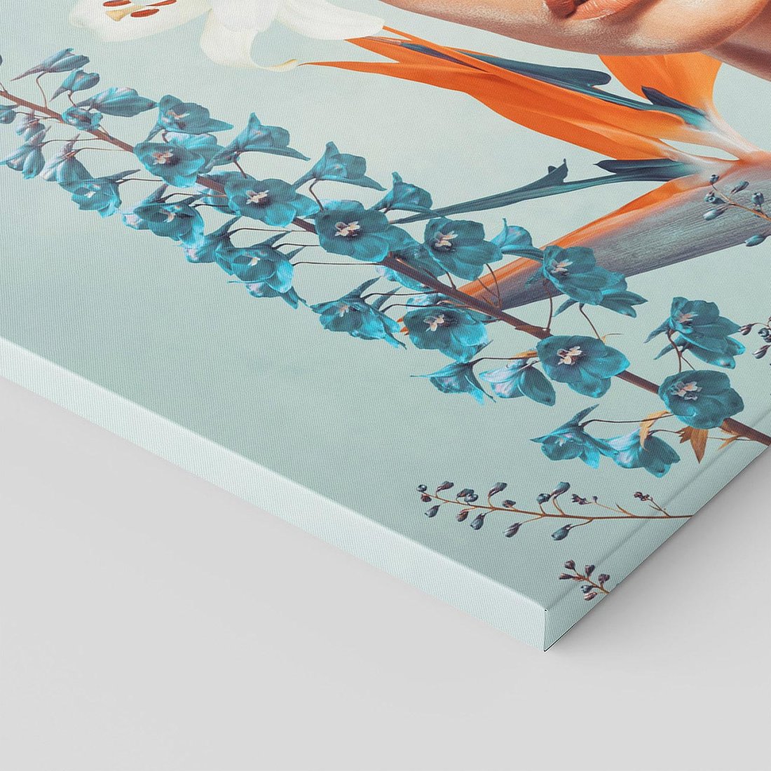 Ten kolaż prezentuje nierealną kompozycję, gdzie portret pięknej kobiety splata się z kwiatowym motywem. Jej twarz i oczy zasłaniają kwiaty, tworząc tajemniczą i zaczarowaną enklawę uroku. "Kwiatowa Enklawa Uroku" to artystyczna podróż w świat wyobraźni, gdzie natura i piękno ludzkiej twarzy tworzą harmonijną i niesamowitą całość.