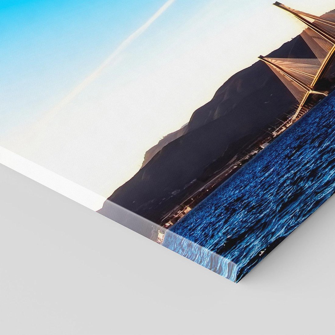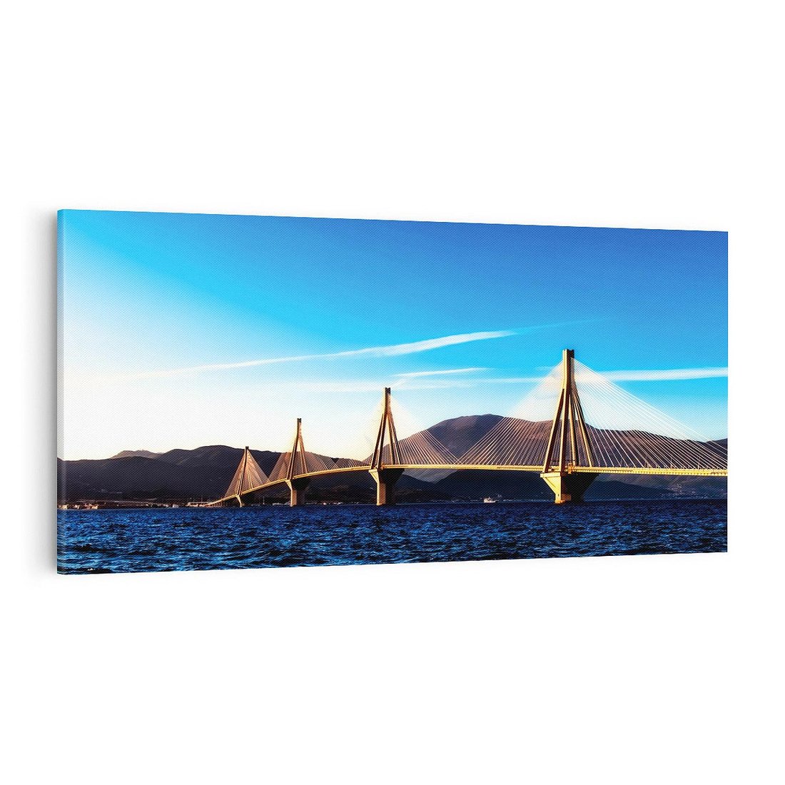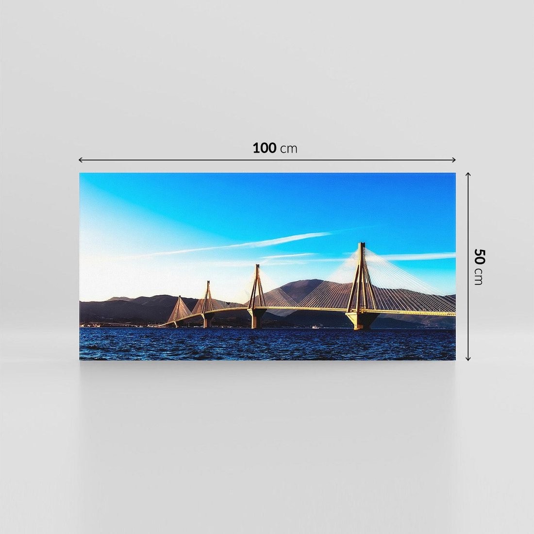 Ten imponujący obraz przedstawia most wznoszący się nad malowniczą rzeką. Ciesz się widokiem jego eleganckiej konstrukcji i harmonii z otaczającą przyrodą, dodając nutę spokoju i piękna do swojego wnętrza tym wyjątkowym obrazem.
