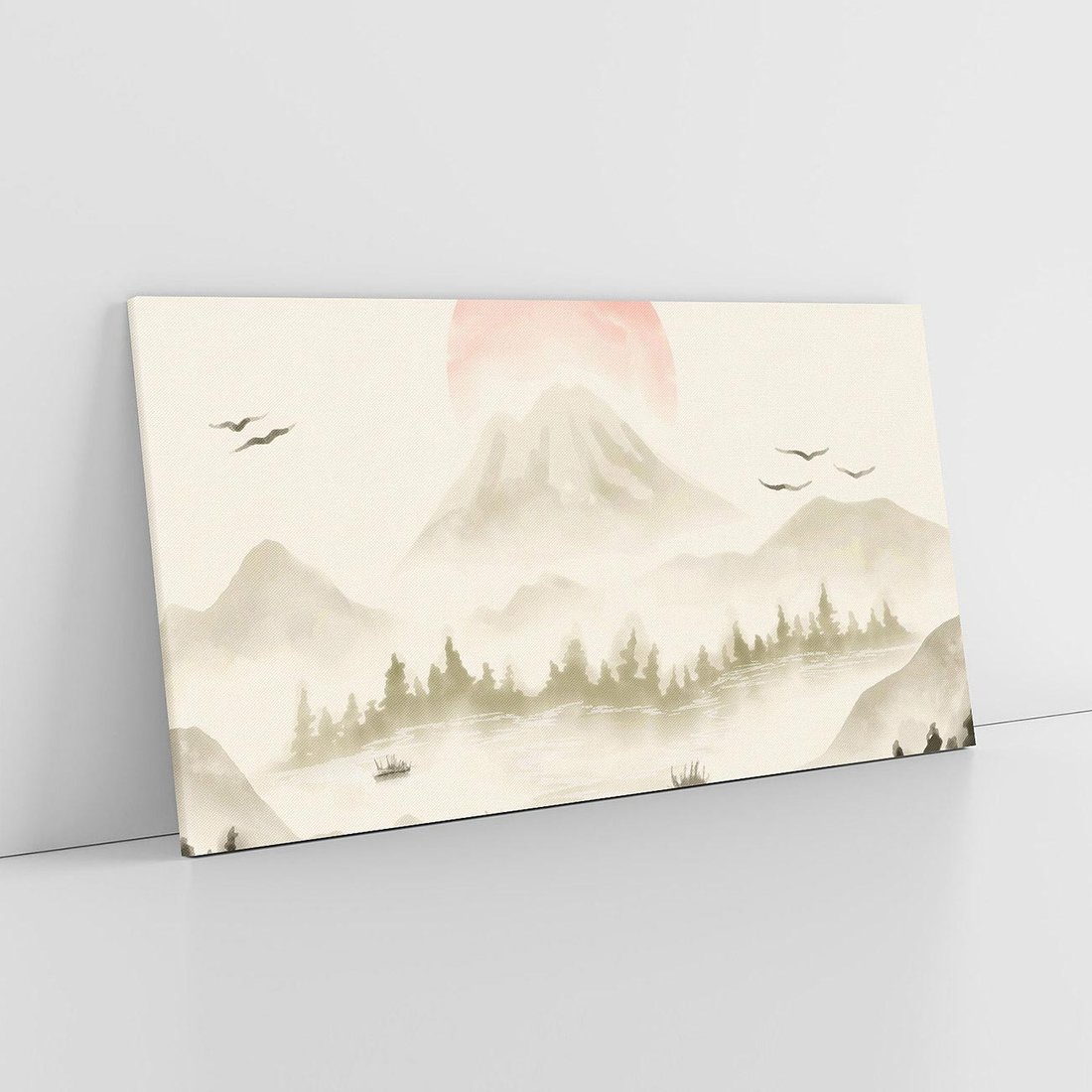 Ta urocza japońska akwarela przedstawia malownicze góry, las i zamglone jezioro, oświetlone przez czerwone słońce. Kompozycja emanuje spokojem i harmonią natury, charakterystyczną dla krajobrazów Japonii. Delikatne linie i subtelne kolory tworzą wrażenie mglistego poranka.