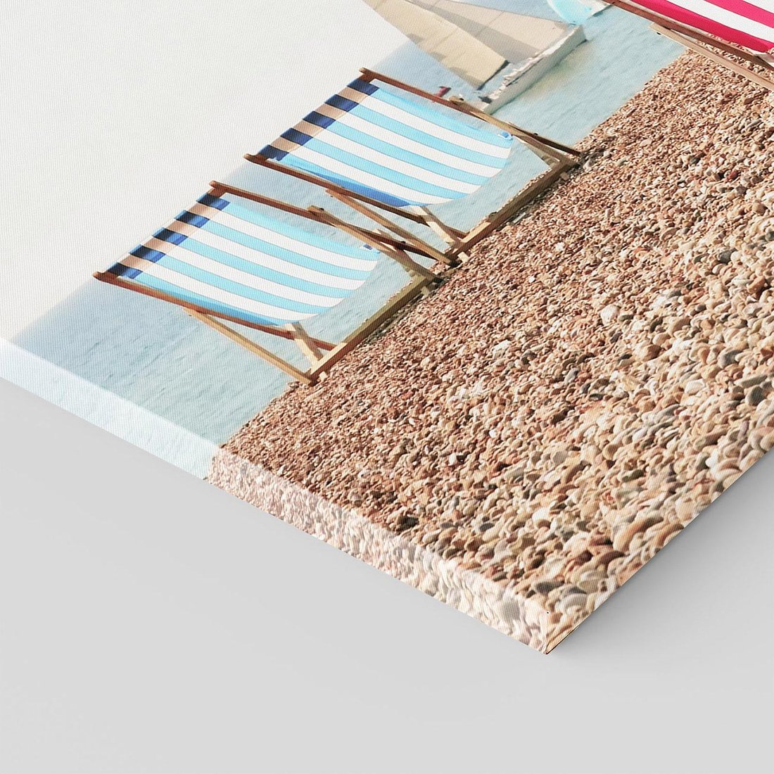 Zanurz się w letnią atmosferę dzięki tej urokliwej fotografii. Na obrazie widzimy pasiaste leżaki na plaży, nad morzem, z żaglówkami w tle. Klimat retro dodaje uroku i nostalgii. To fotograficzne dzieło sztuki stworzone dla miłośników wakacyjnych wspomnień i morskich krajobrazów. Doskonały akcent dla tych, którzy pragną wprowadzić do swoich wnętrz relaksacyjny i letni nastrój.