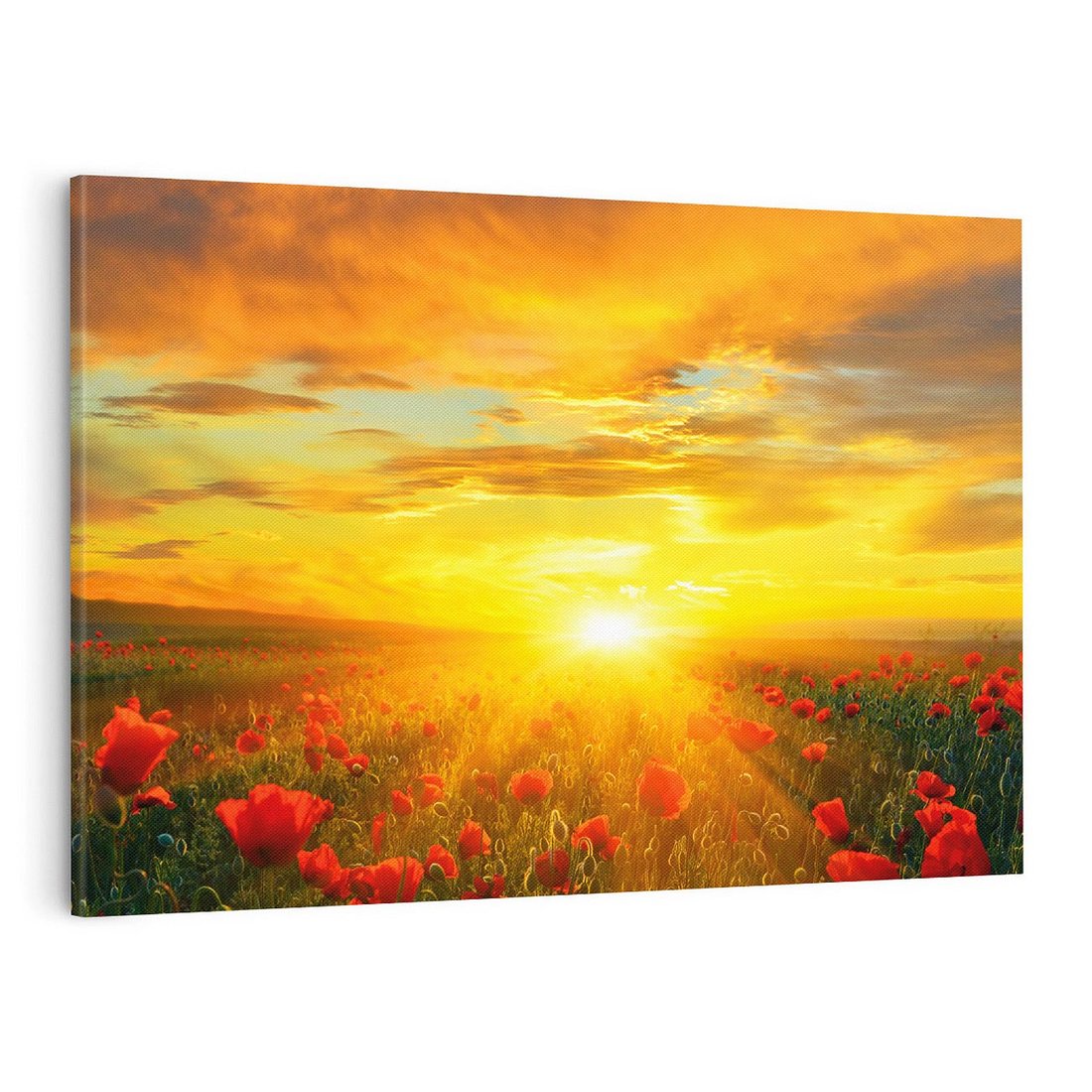 Ożyw swoje wnętrze tym ujmującym obrazem przedstawiającym magiczny zachód słońca na kolorowej łące pełnej maków. Soczyste kolory, delikatne płatki i złote promienie tworzą malowniczą kompozycję. Ten obraz dodaje romantyzmu i odczucia piękna natury, idealny dla miłośników zachodów słońca i kwiatów.