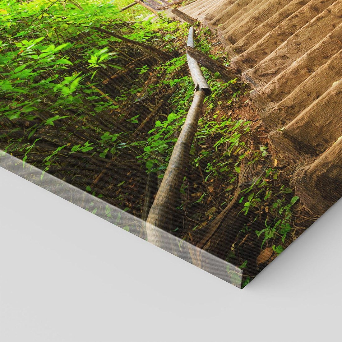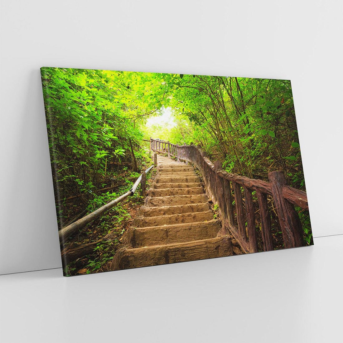 Ten ujmujący obraz na płótnie przedstawia magiczne schody prowadzące przez gęsty las drzew. Jego zielone odcienie, tajemnicza atmosfera i mistyczny krajobraz przeniosą Cię w odległe miejsce pełne czarów. Dodaj nutę tajemnicy i przyrody do swojego wnętrza.