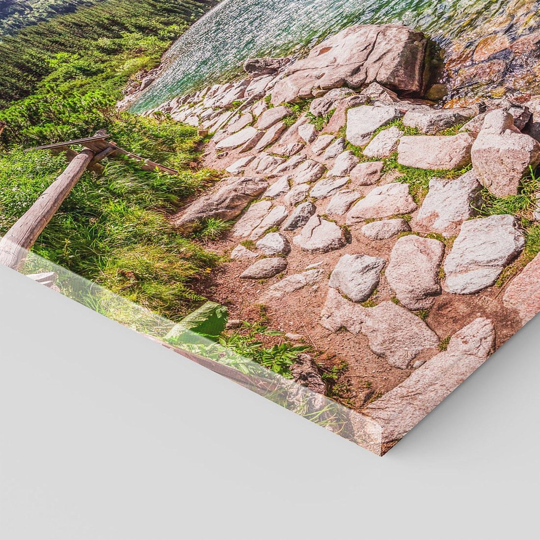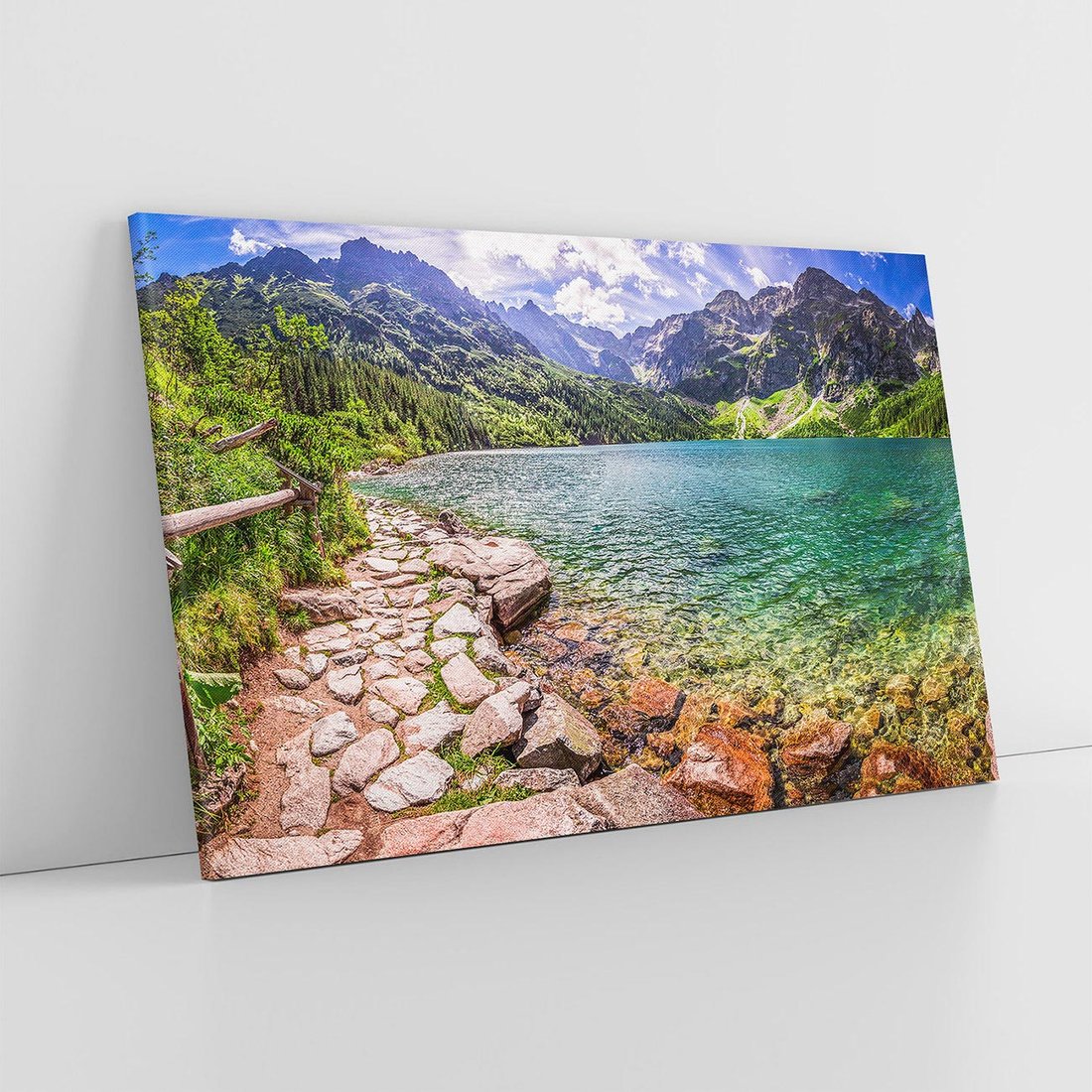 Odkryj wspaniałość górskiego krajobrazu dzięki temu malowniczemu obrazowi przedstawiającemu jezioro otoczone przez majestatyczne szczyty. Szmaragdowa woda, ośnieżone wierzchołki i spokojna atmosfera tworzą urokliwy obraz. Ta kompozycja dodaje harmonii i siły natury, idealna dla miłośników górskich widoków i odprężającej scenerii.