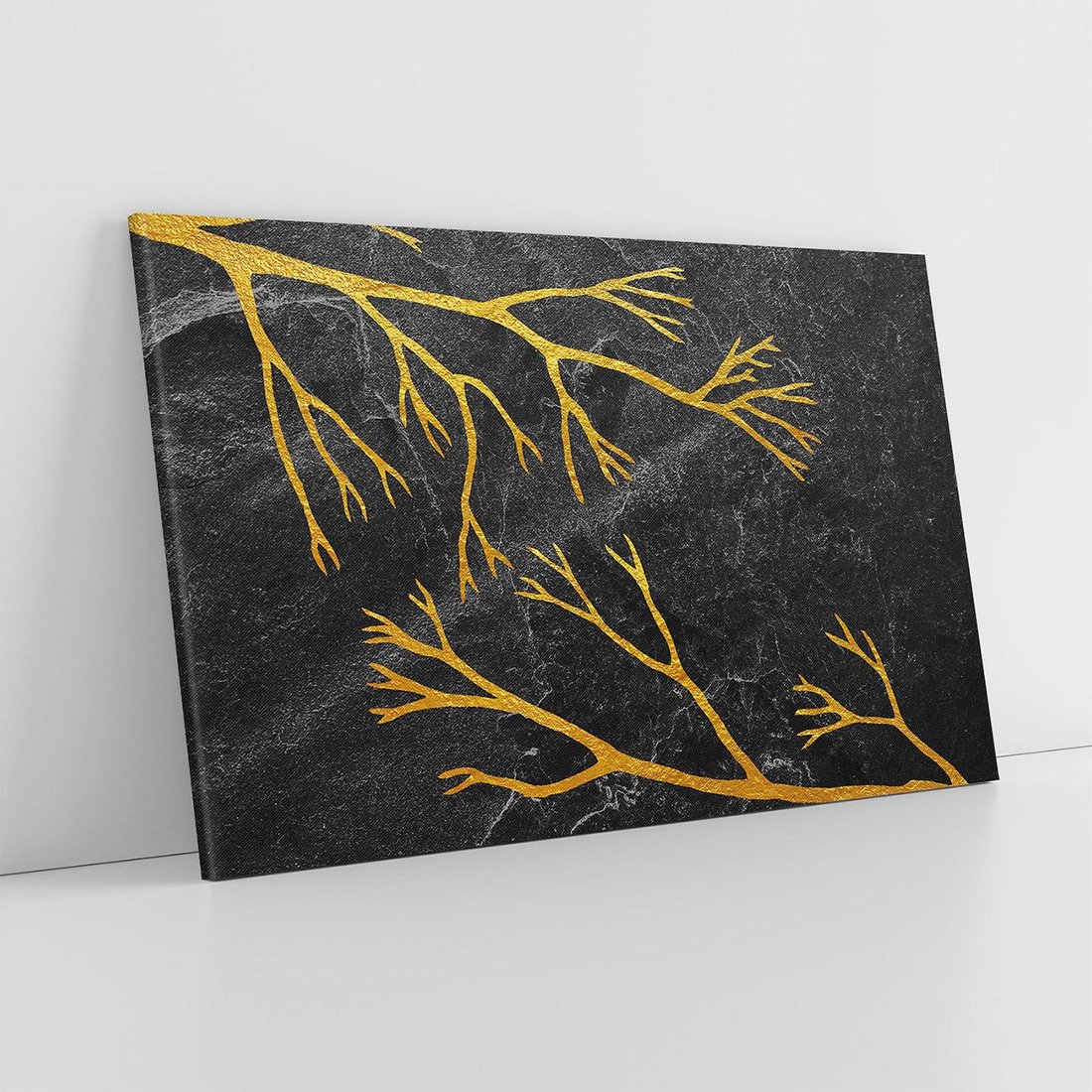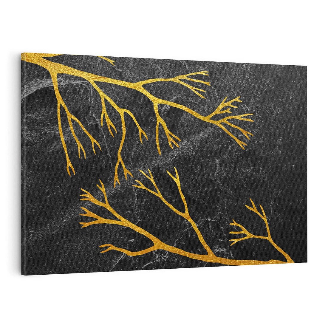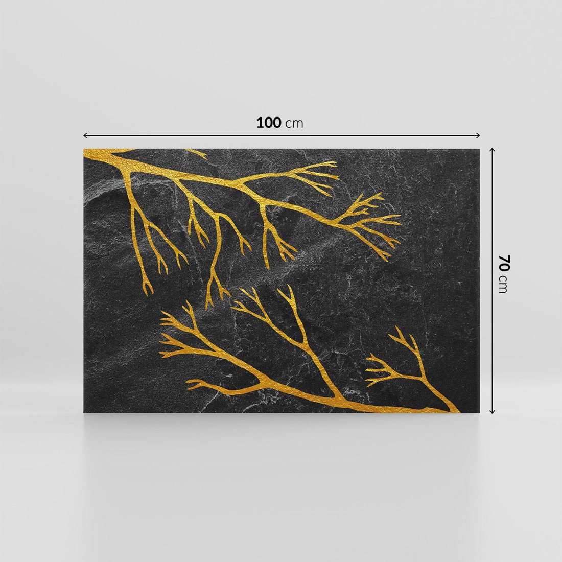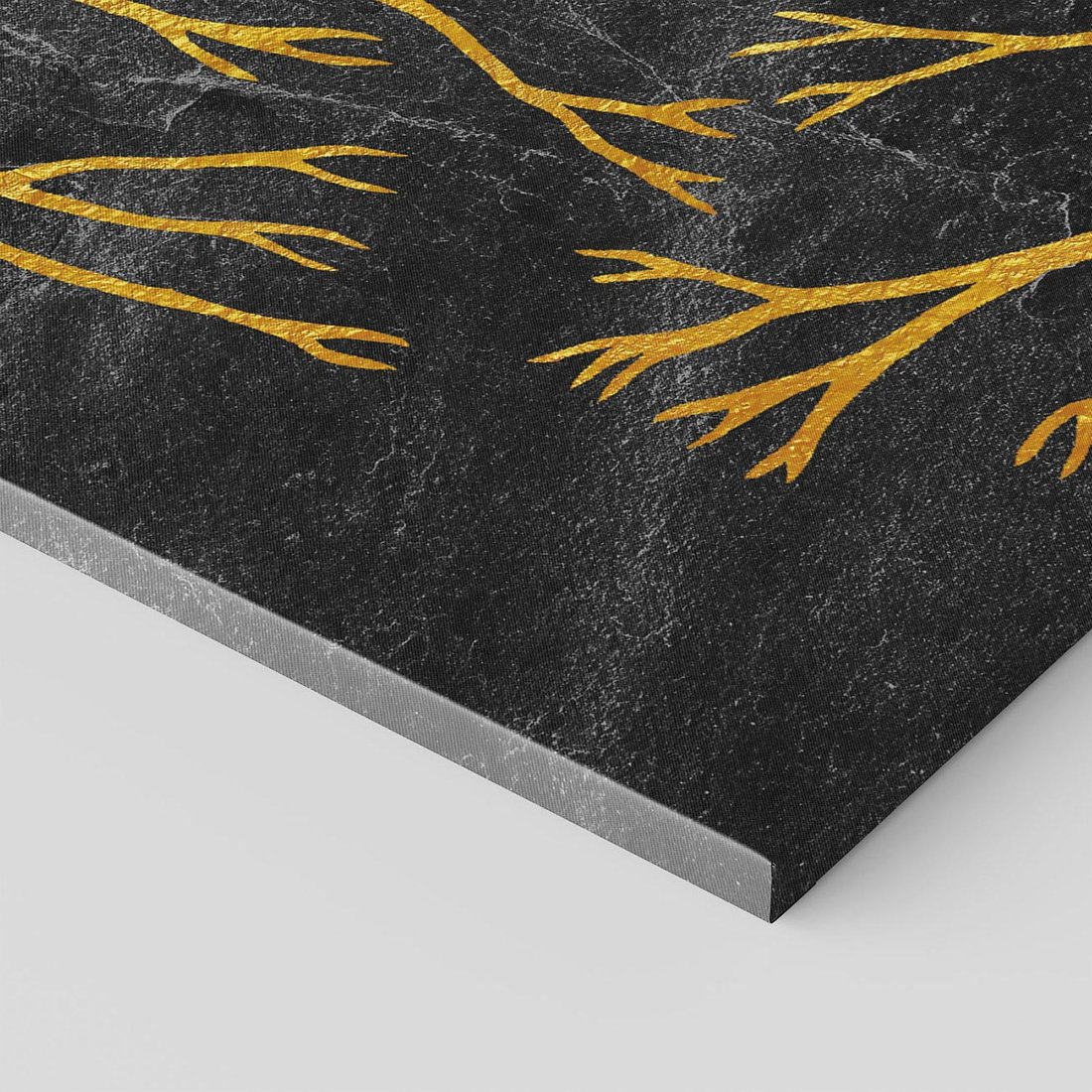 Ten metaforyczny obraz przedstawia złote gałęzie drzew na czarnym marmurowym tle, emanujący elegancją i tajemniczym urokiem. Minimalistyczny design podkreśla wyrafinowany charakter kompozycji. To dzieło sztuki przenosi widza w niezwykłą przestrzeń, gdzie złoto symbolizuje światło i nadzieję w ciemnościach. Idealny dodatek do wnętrz, które pragną zachować wyjątkowy i niezwykły wystrój.