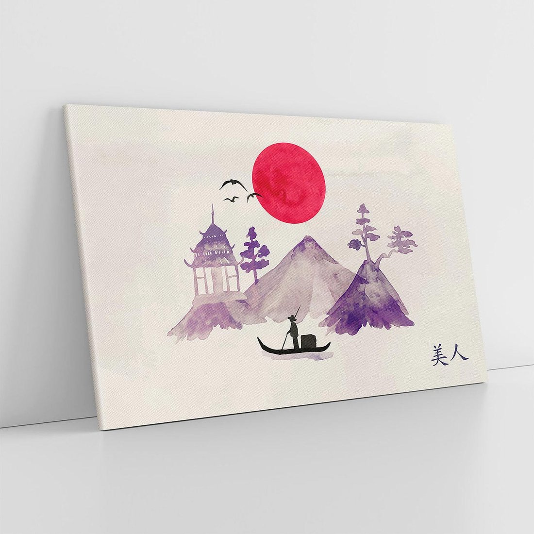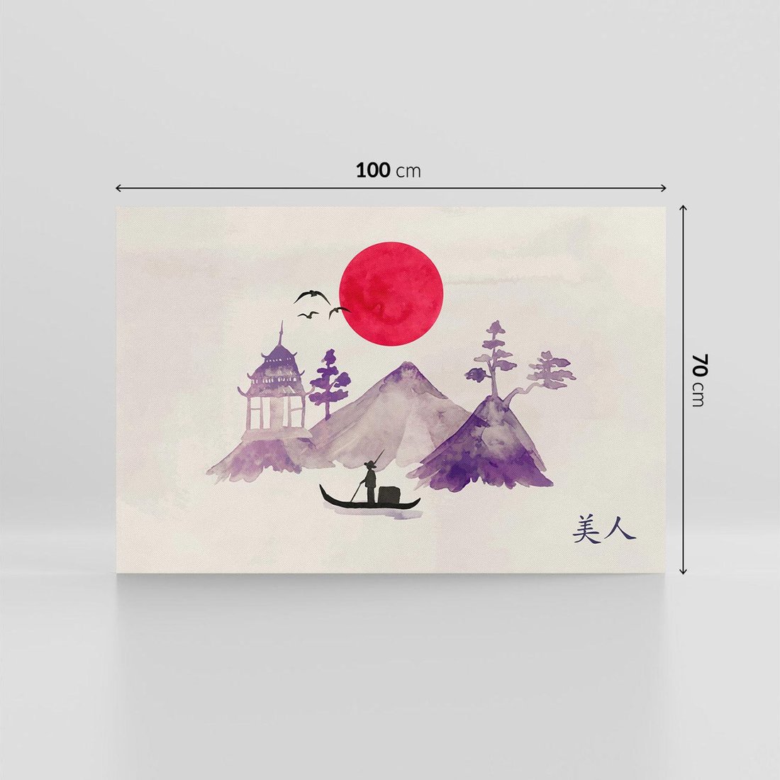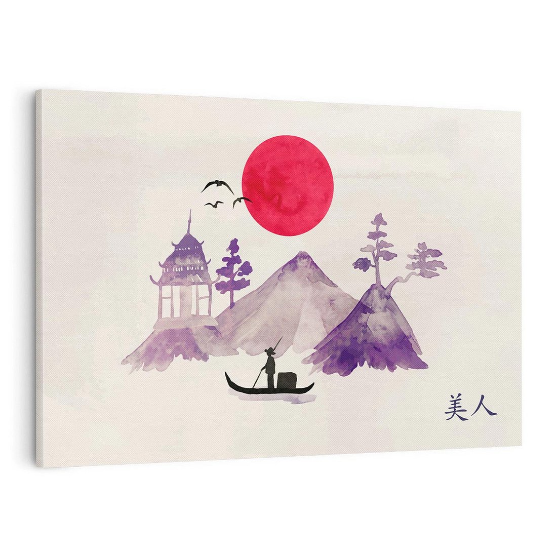 Ta urocza akwarela ukazuje japońską łódź na spokojnym jeziorze, z czerwonym słońcem na horyzoncie. Sztuka emanuje harmonią i spokojem, charakterystycznymi dla japońskiej sztuki. Przenosząc nas w magiczny świat natury, obraz ukazuje urok przyrody i zachodu słońca.