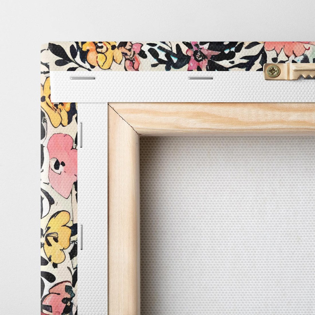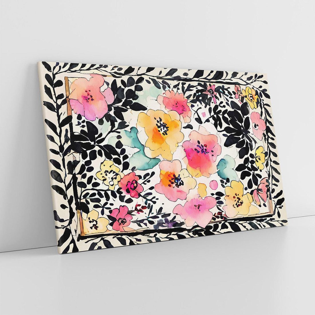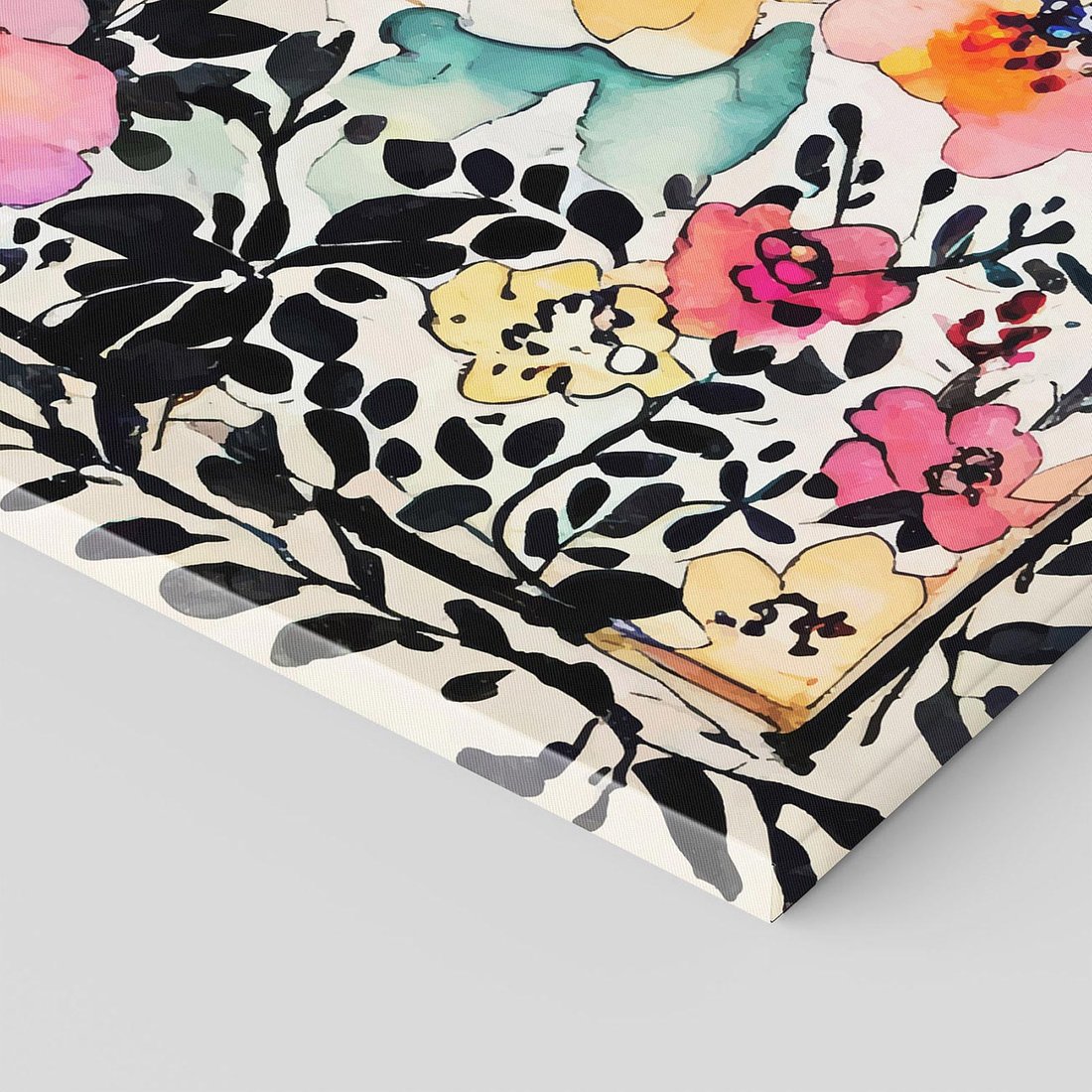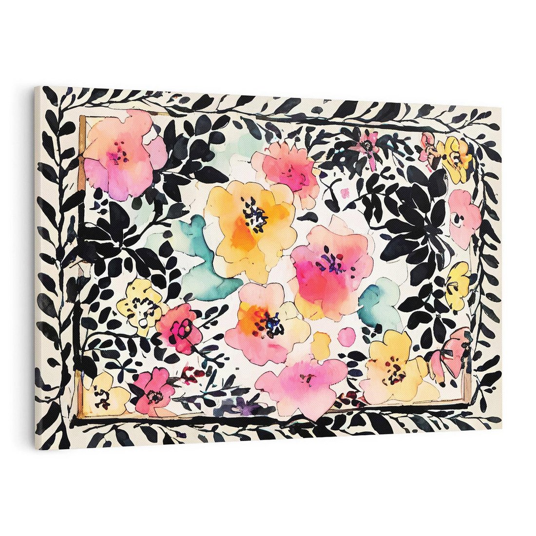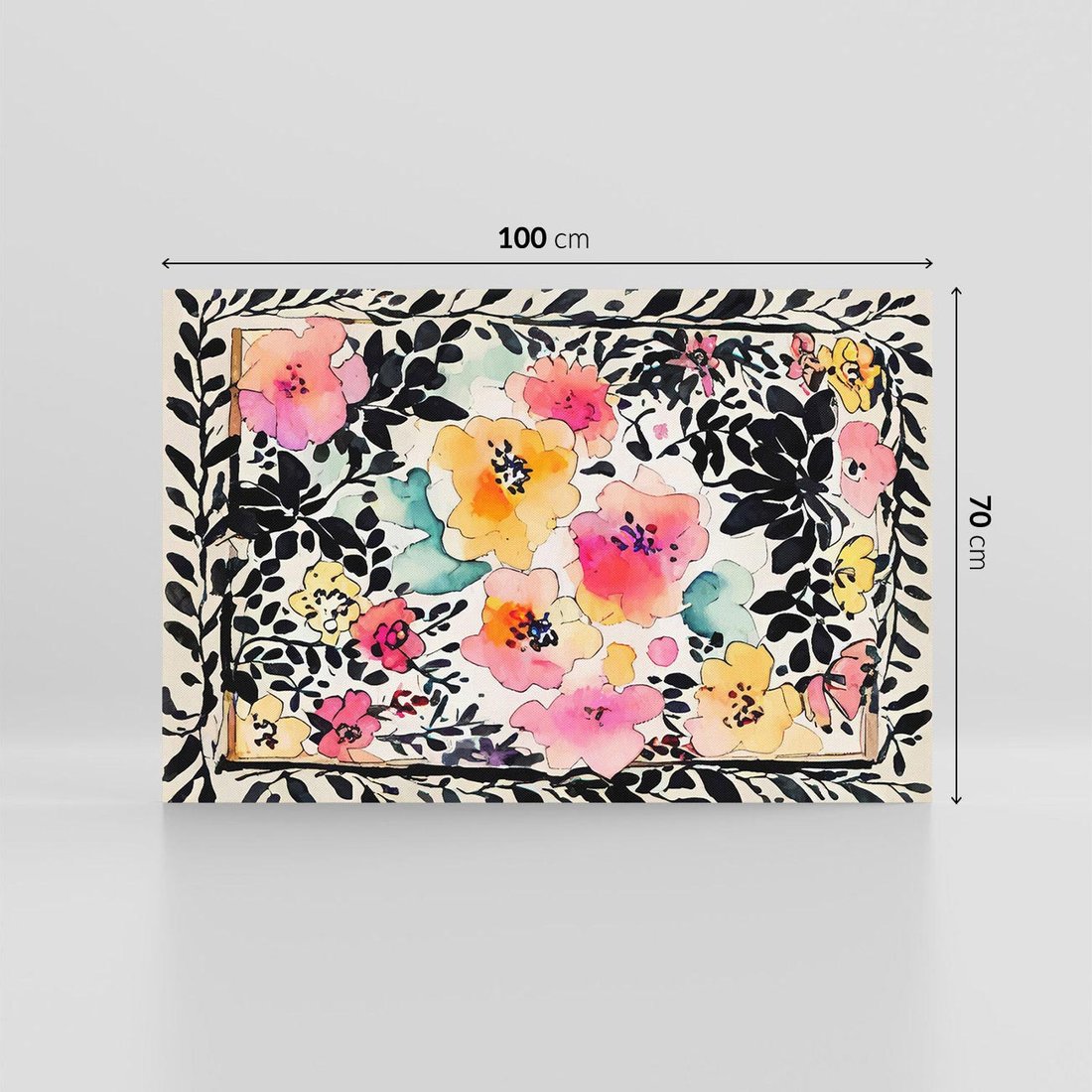 Obraz na płótnie 100x70 - Opowieść w kroplach farb - akwarelowe kwiaty, mocna ornamentowa czarna ramka namalowana dookoła obrazu