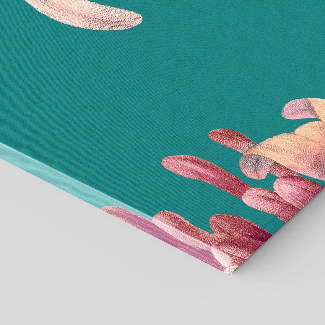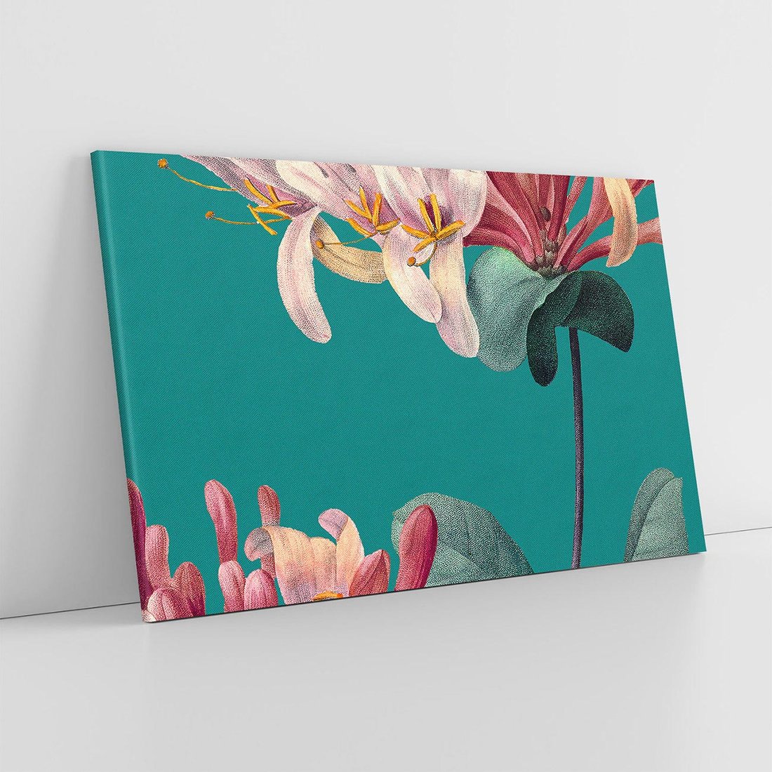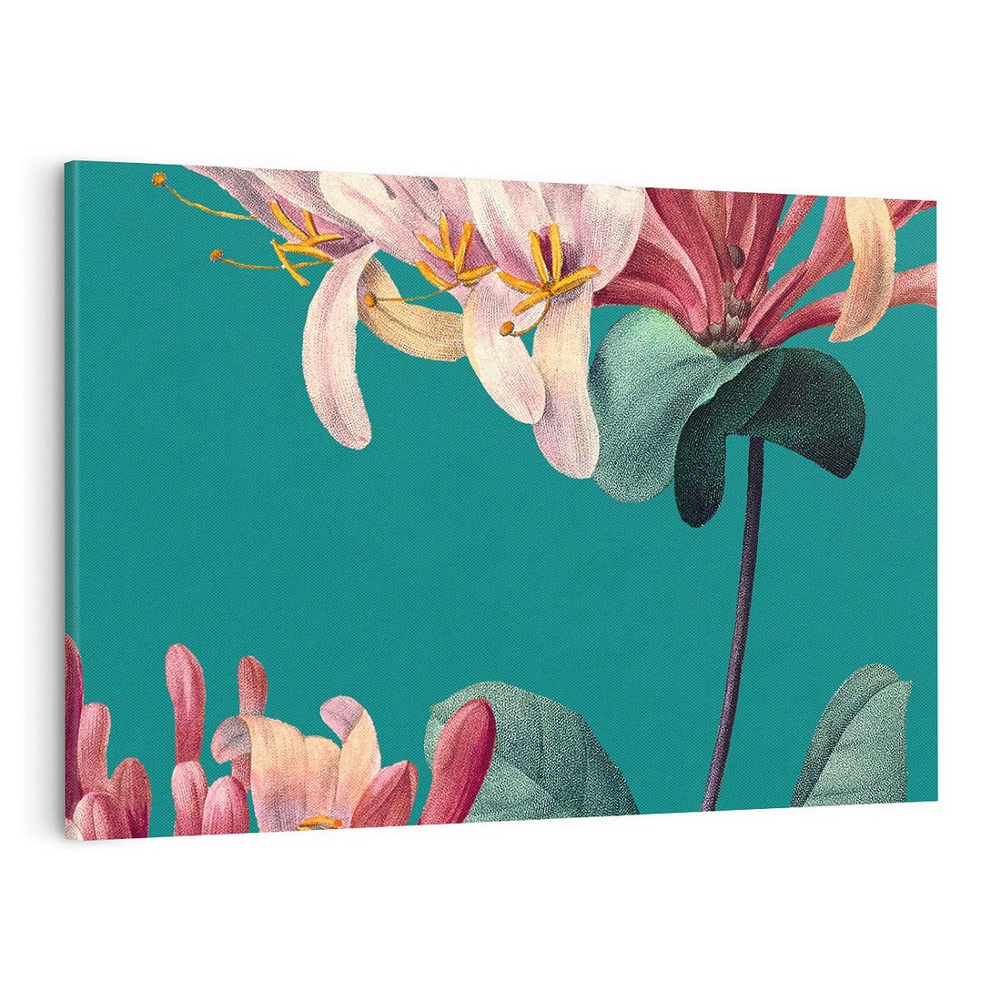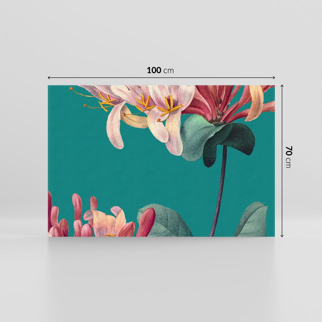 Wielkoformatowa grafika w stylu vintage ukazuje mistyczne zbliżenie na kwiaty, które unoszą się na tle w morksim kolorze. To magiczne połączenie natury i nostalgii, gdzie delikatne kwiaty pokazują wszystkie swoje detale. To harmonijne wyrażenie siły natury i subtelności kwiatowej elegancji.