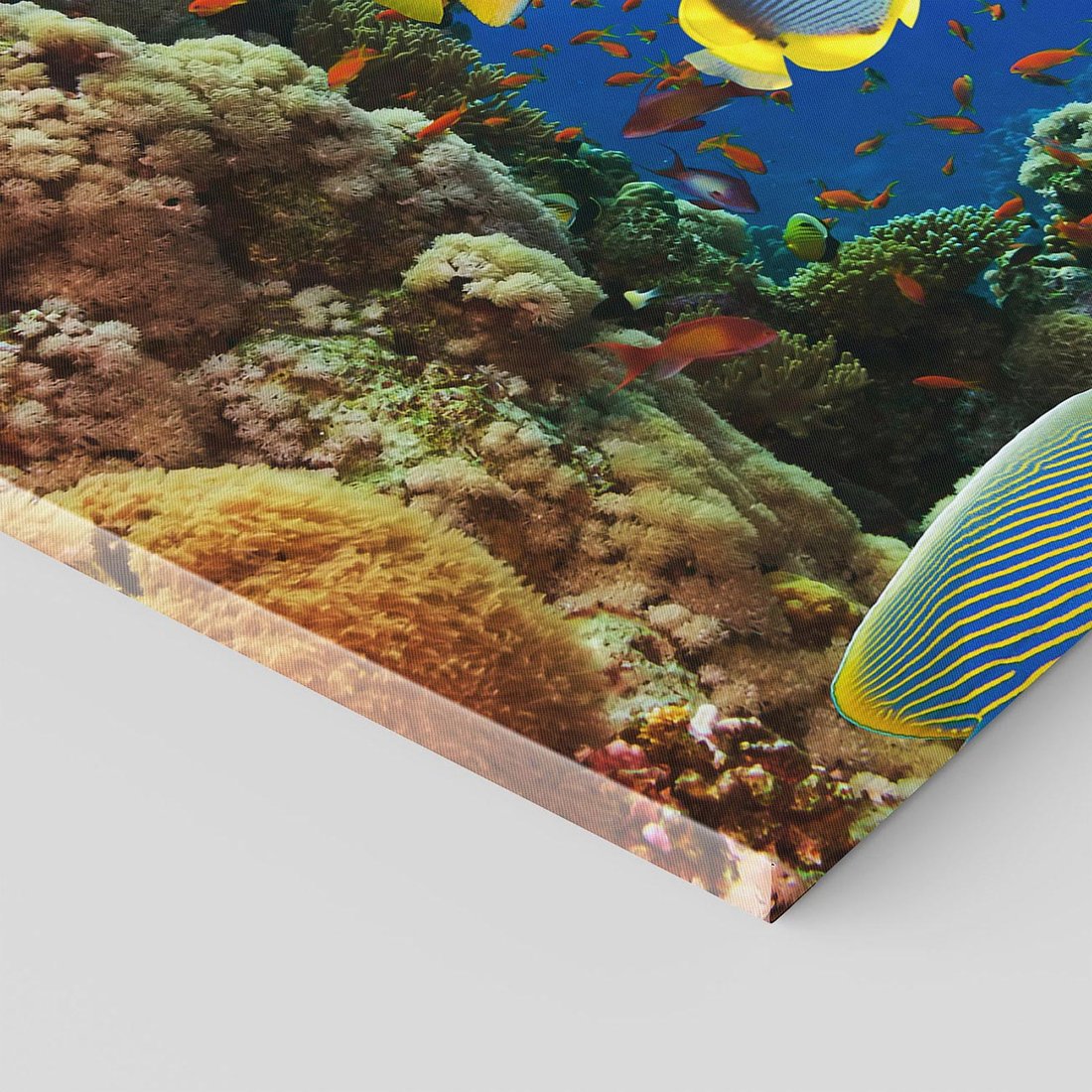 Obraz na płótnie zaprasza do podwodnego świata pełnego kolorowych raf koralowych i żywych rybek. Artysta oddaje bogactwo detali i intensywność barw, tworząc wrażenie zanurzenia w tajemniczym oceanicznym królestwie. Ten obraz ożywi każde wnętrze swoją niezwykłą energią.