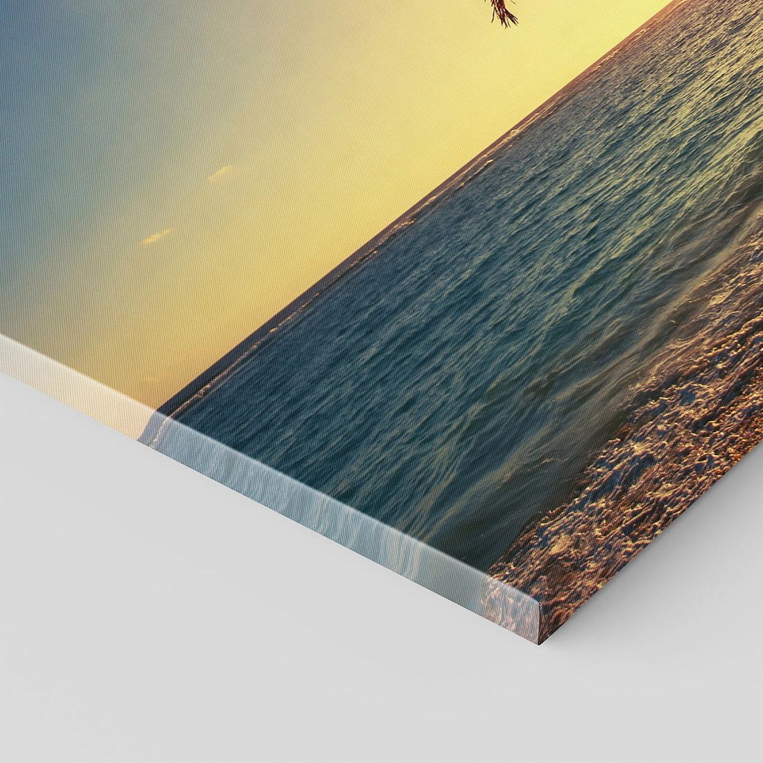 Przenieś się w magiczne chwile zachodu słońca na tropikalnej plaży dzięki temu malowniczemu obrazowi. Ciepłe kolory, palmowe drzewa i błyszczące morze tworzą romantyczną atmosferę. Ta kompozycja dodaje błogości i egzotycznego klimatu, idealna dla osób pragnących przenieść się w magiczne chwile i oddać się pięknu tropikalnej przyrody.
