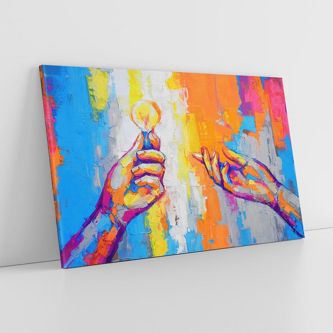 Obraz na płótnie 100x70 - Refrakcje wewnętrznego światła - abstrakcyjne dzieło, dłoń trzyma żarówkę