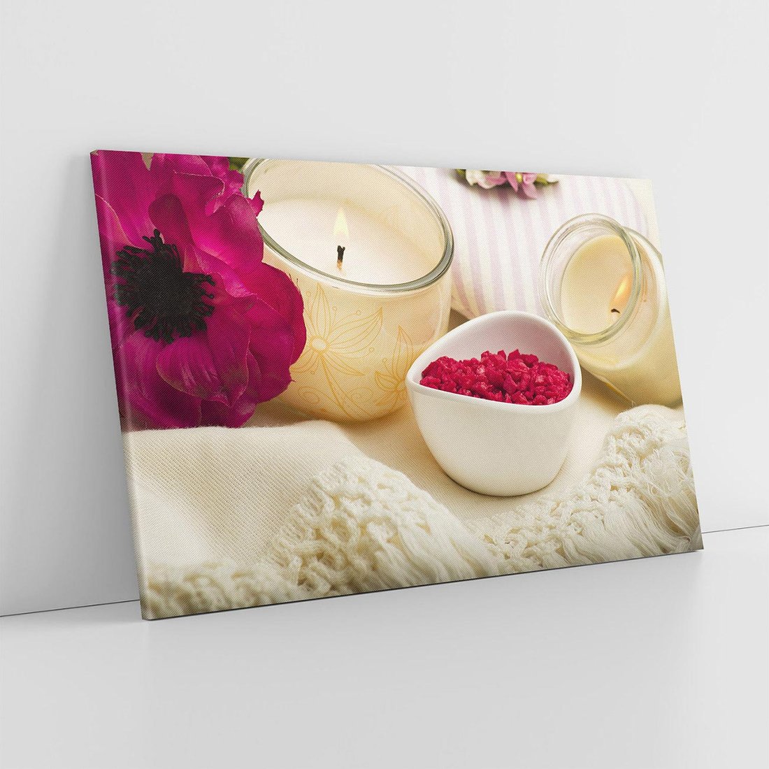 Obraz na płótnie 100x70 - Relaksujący moment: świeczki i kwiaty w SPA - świeczki, kwiat