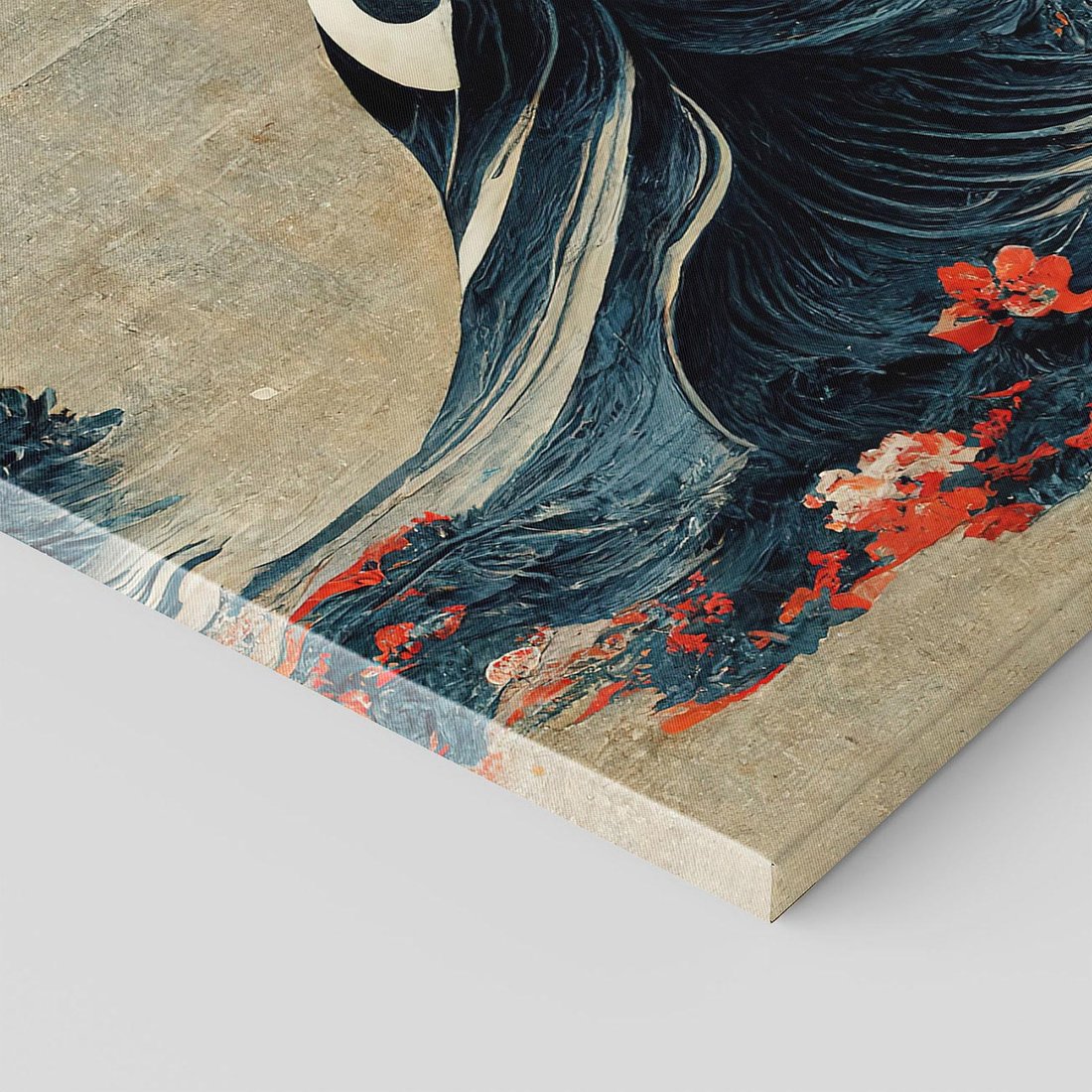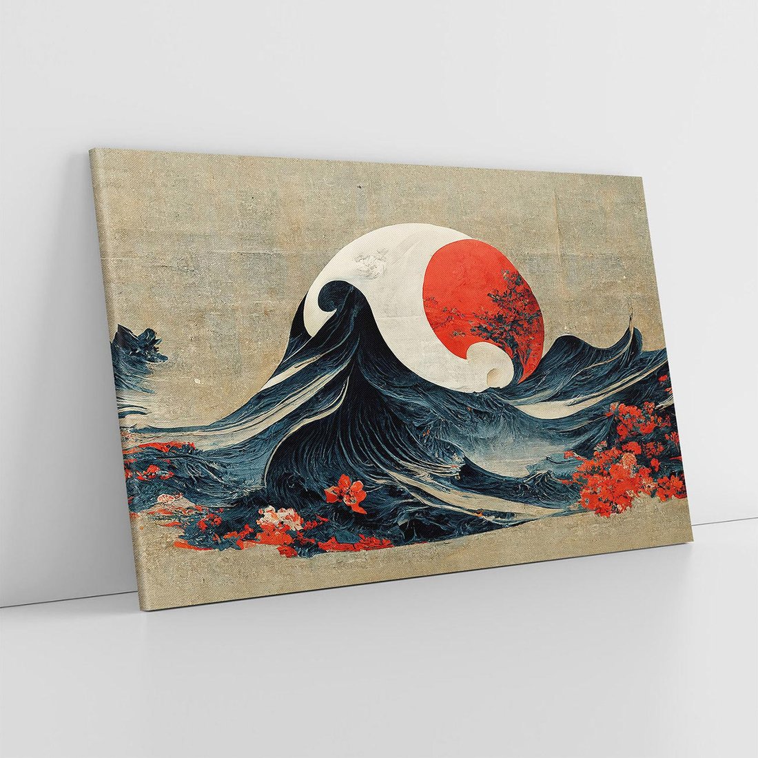 Przenieś się do fascynującego świata sztuki japońskiej z tym ujmującym obrazem. Fale oceanu oraz odcienie bieli i czerwieni ożywiają płótno, a kwiaty wiśni dodają delikatnego uroku. To dzieło sztuki stworzone dla miłośników elegancji i natury. Doskonały akcent dla tych, którzy pragną wprowadzić harmonię i subtelny wyraz do swoich wnętrz.
