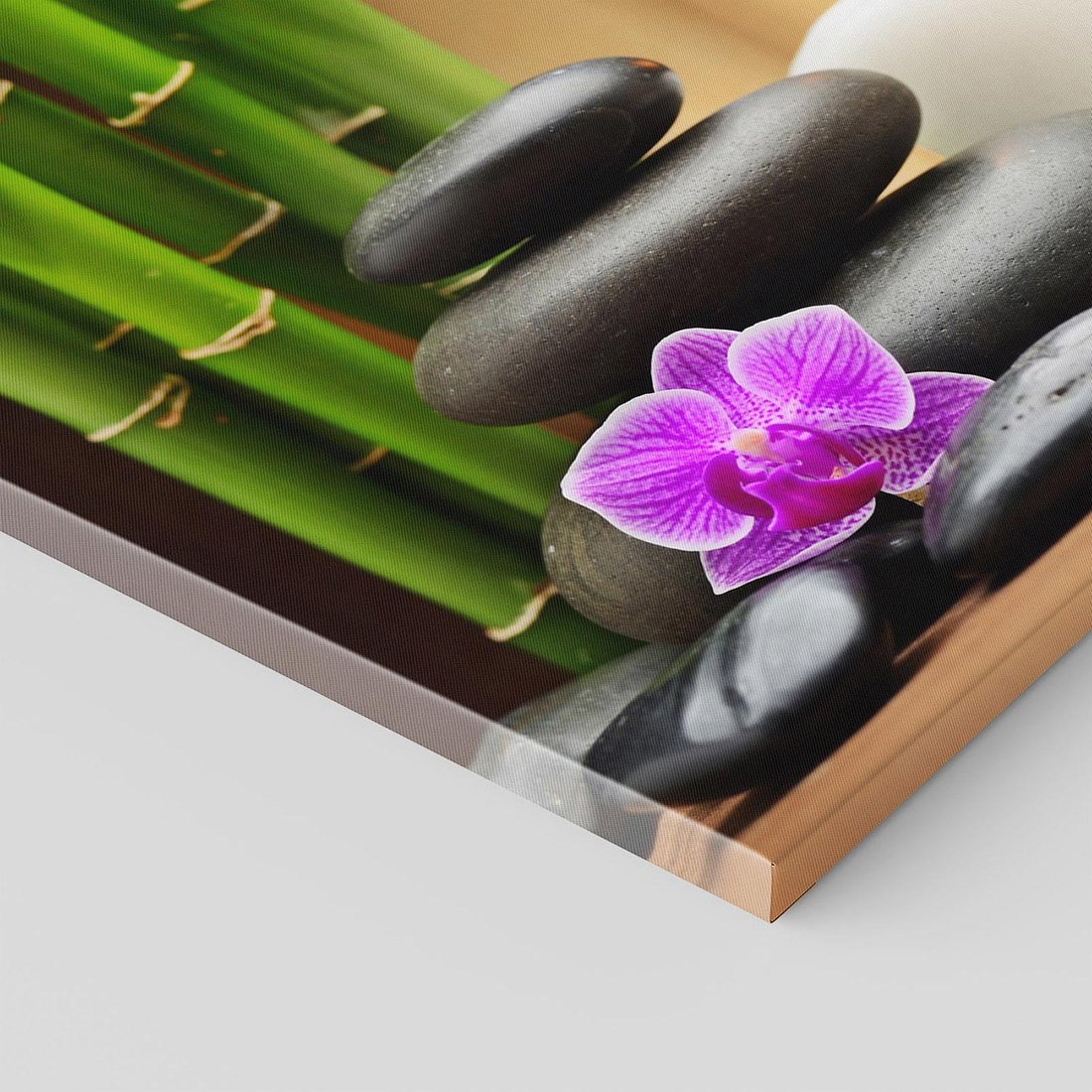 Przenieś się do spokojnego zakątka SPA dzięki temu ujmującemu obrazowi na płótnie. Bambus, kamienie i delikatne kwiaty tworzą atmosferę harmonii i ukojenia. Dodaj naturalnego piękna i siły natury do swojego wnętrz