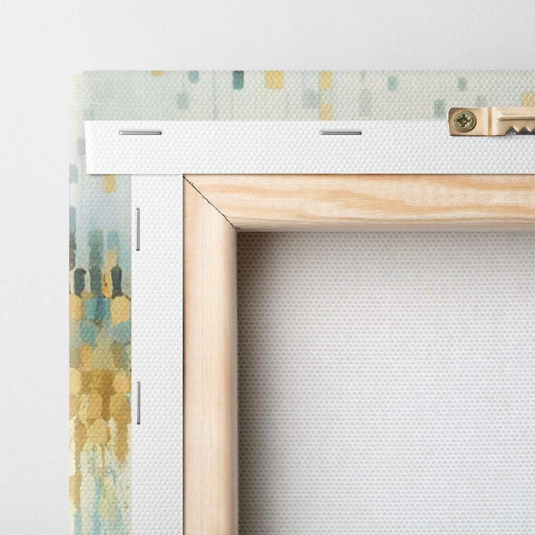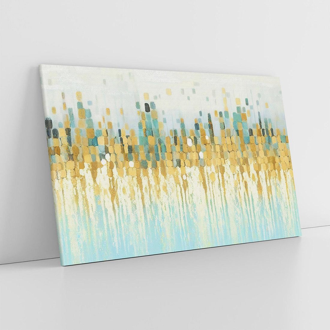 Ten abstrakcyjny obraz w nowoczesnym stylu, z geometrycznymi plamkami w odcieniach złota, emanuje harmonią i spokojem. Jego świeży design stanie się doskonałym akcentem dekoracyjnym, dodając elegancji i wyrafinowania każdemu wnętrzu.