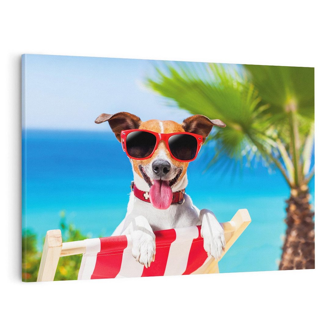 Ożyw swoje wnętrze tym uroczym obrazem przedstawiającym psa w okularach na tle wakacyjnych akcesoriów. Słoneczne promienie, radosna energia i wakacyjny nastrój tworzą beztroską atmosferę. Ta kompozycja dodaje uśmiechu i radości, idealna dla miłośników zwierząt i wakacyjnych wspomnień.