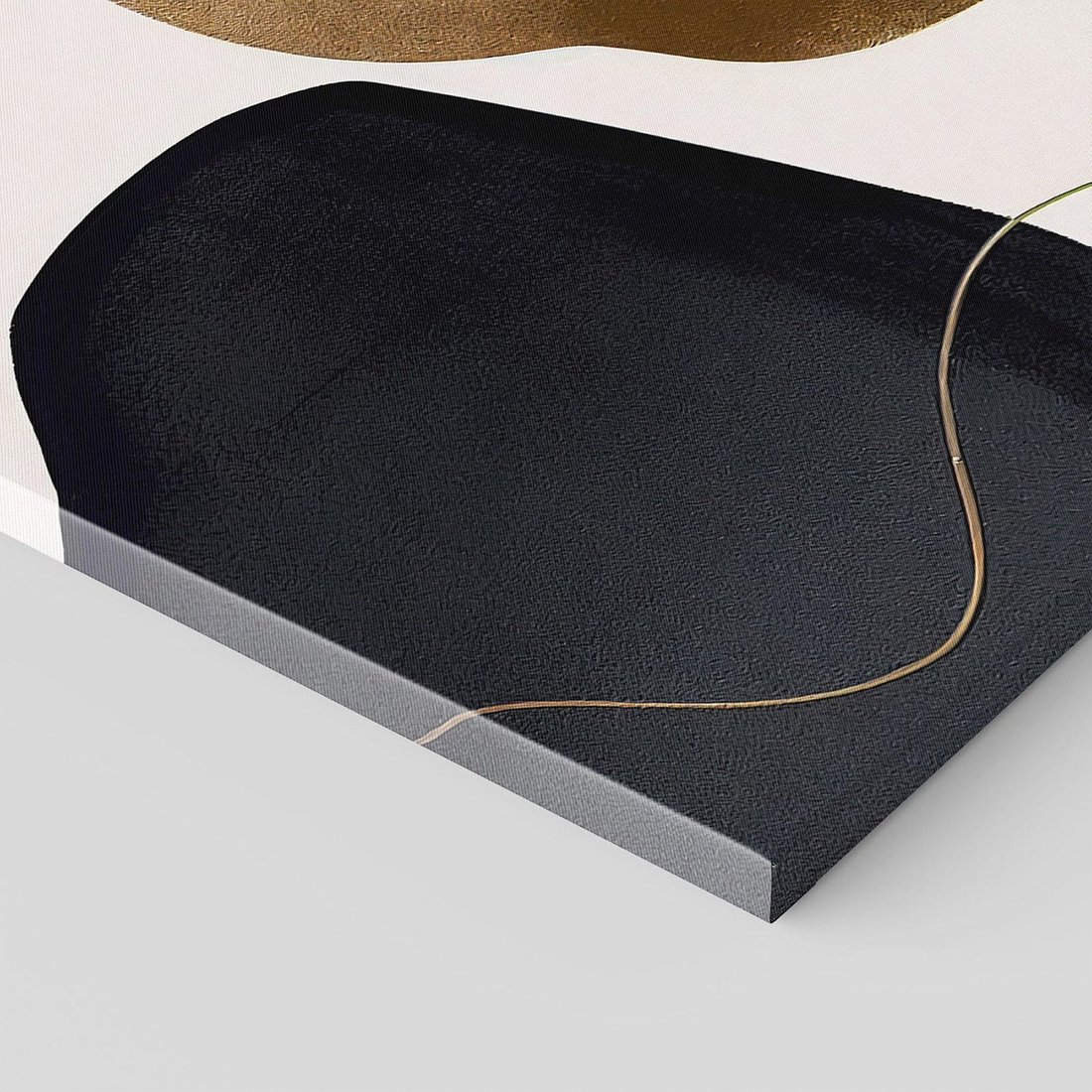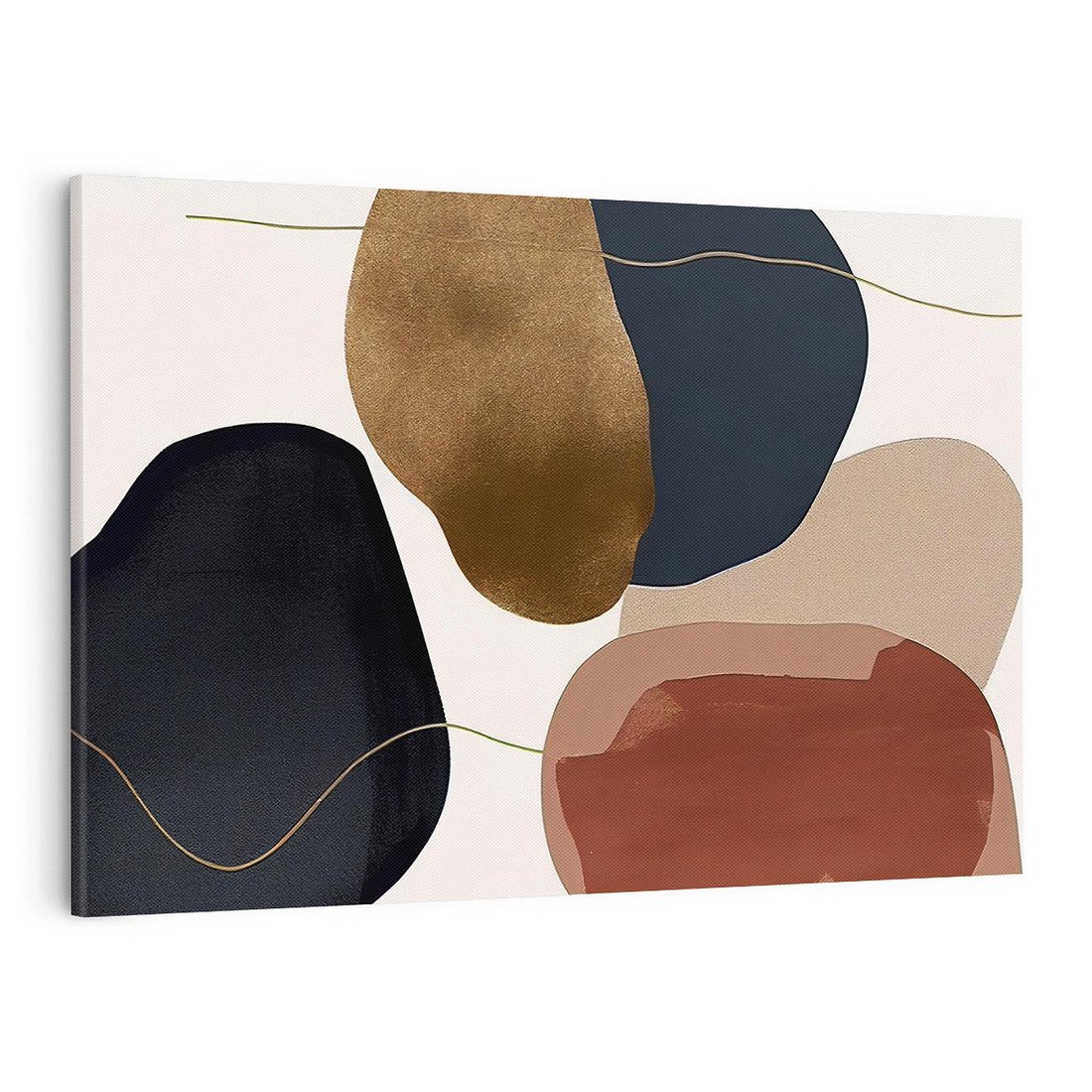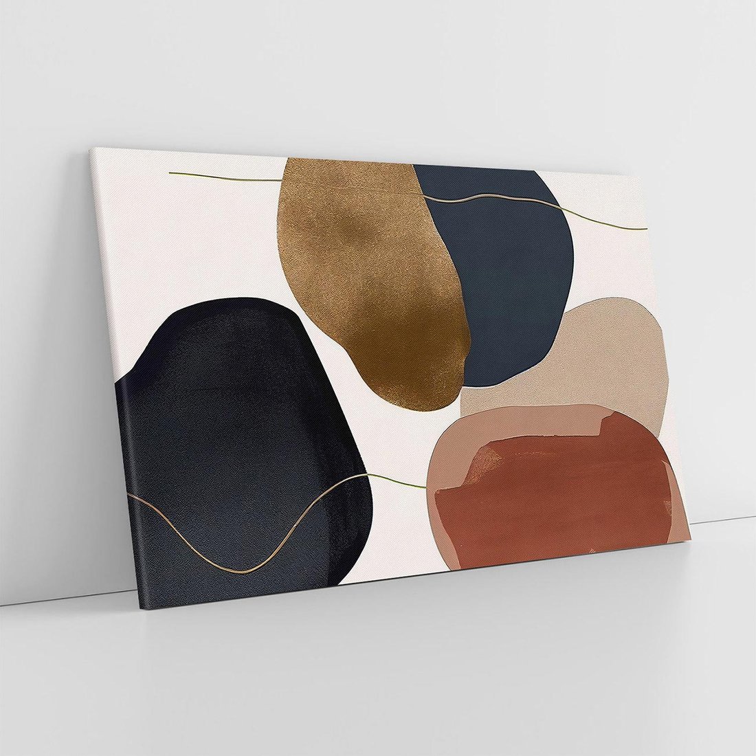 Odkryj abstrakcyjny obraz z nieregularnymi plamami w czarnym, złotym i brązowym na beżowym tle. Złote linie kreski dodają elegancji. Dla miłośników sztuki poszukujących wyjątkowych dzieł do nowoczesnych i klasycznych wnętrz.