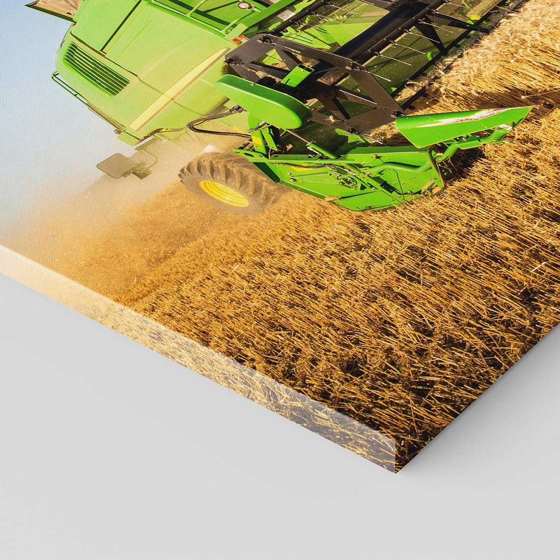 Ten dynamiczny obraz na płótnie ukazuje złociste żniwa, a w tle masywny kombajn. Jego intensywne kolory i detale związane z pracą na polu przynoszą atmosferę wiejskiego krajobrazu i siłę natury. Dodaj rustykalnego uroku i siły do swojego wnętrza.