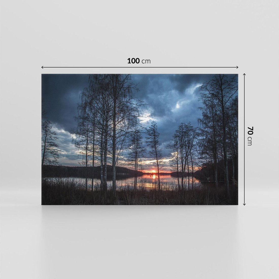 Ten urokliwy obraz przedstawia romantyczny zachód słońca odbijający się na tafli jeziora. Kompozycja pełna ciepłych kolorów i delikatnych refleksów wprowadzi do Twojego wnętrza atmosferę spokoju i zachwytu. Dodaj odrobinę natury i magii zachodu słońca do swojego domu tym wyjątkowym obrazem.