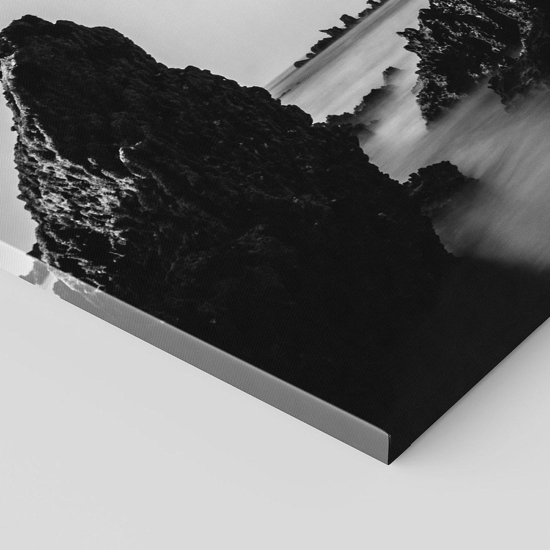 Ta czarno-biała fotografia ukazuje dziką i tajemniczą plażę, gdzie mroczny klimat przeplata się z tajemniczą atmosferą. Skały na brzegu dodają dramatyczności, a zamglony widok dodaje aurze tajemnicy. To pejzaż, który przenosi nas w świat ukrytych historii i nieodkrytych sekretów natury, zapraszając nas do kontemplacji i marzeń.
