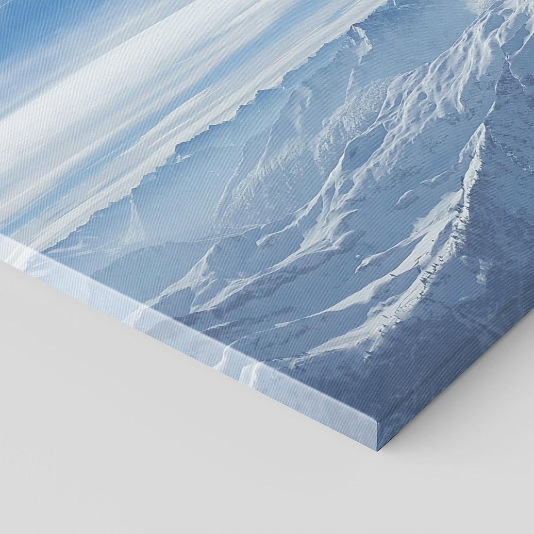 Odkryj magiczny świat zimowych gór w pełnym rozkwicie dzięki temu uroczemu obrazowi. Srebrzyste szczyty, błękitne niebo i pokryta śniegiem roślinność tworzą niezwykły widok. Ta kompozycja dodaje uczucia chłodzenia i siły natury, idealna