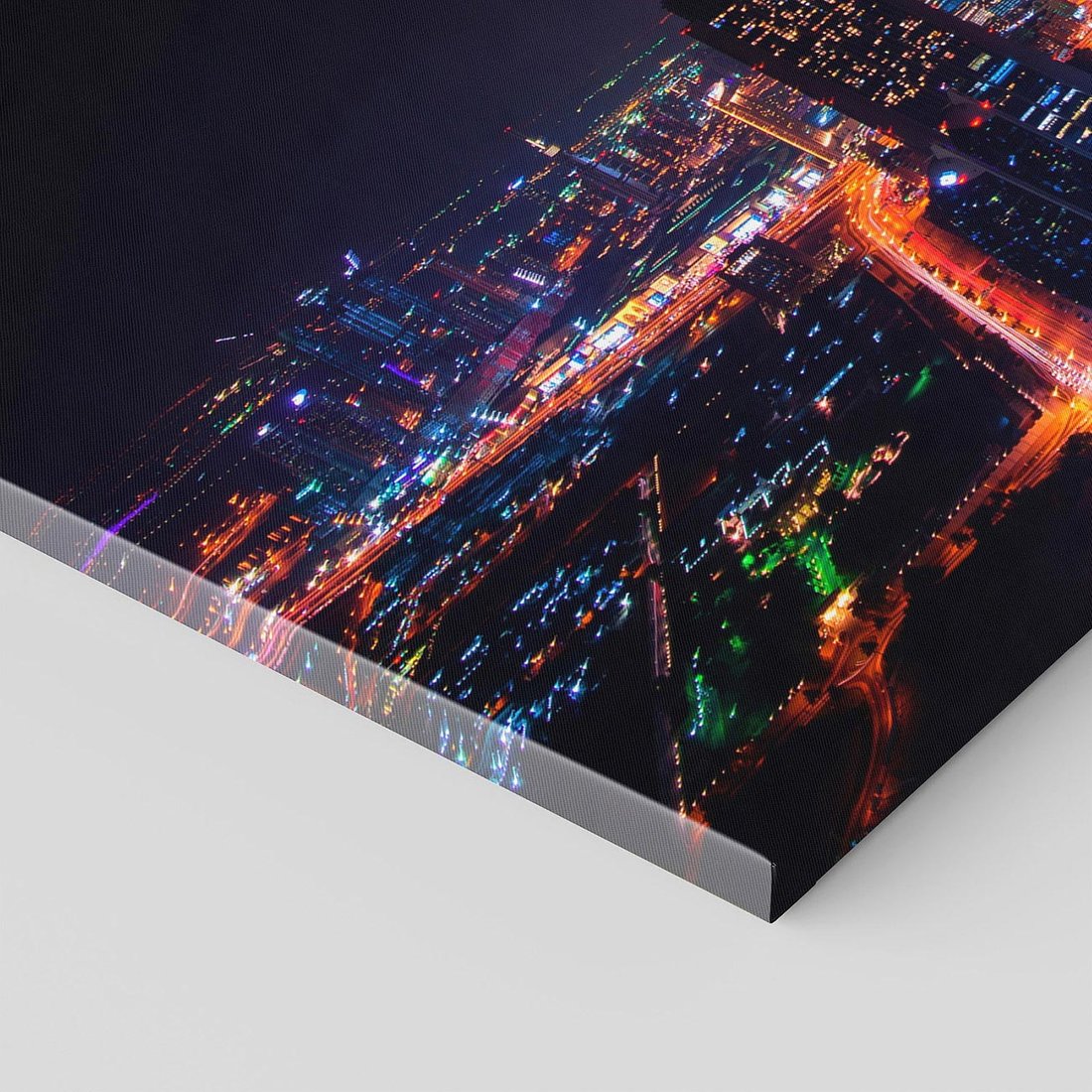 Przenieś się w nocne oświetlenie miasta dzięki temu obrazowi przedstawiającemu malowniczą panoramę. Migoczące światła, wysokie wieżowce i tajemnicza atmosfera tworzą niesamowity widok. Ten obraz dodaje energii i fascynacji miejskim krajobrazem, idealny dla miłośników nocnych pejzaży i atmosfery wielkomiejskich nocy.