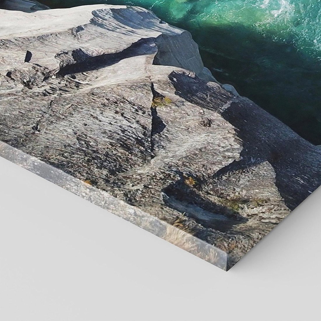 Przenieś się w malowniczy krajobraz rzeki przepływającej wśród skalistych klifów na obrazie. Poczuj energię i siłę przyrody, obserwując tę dynamiczną scenę.