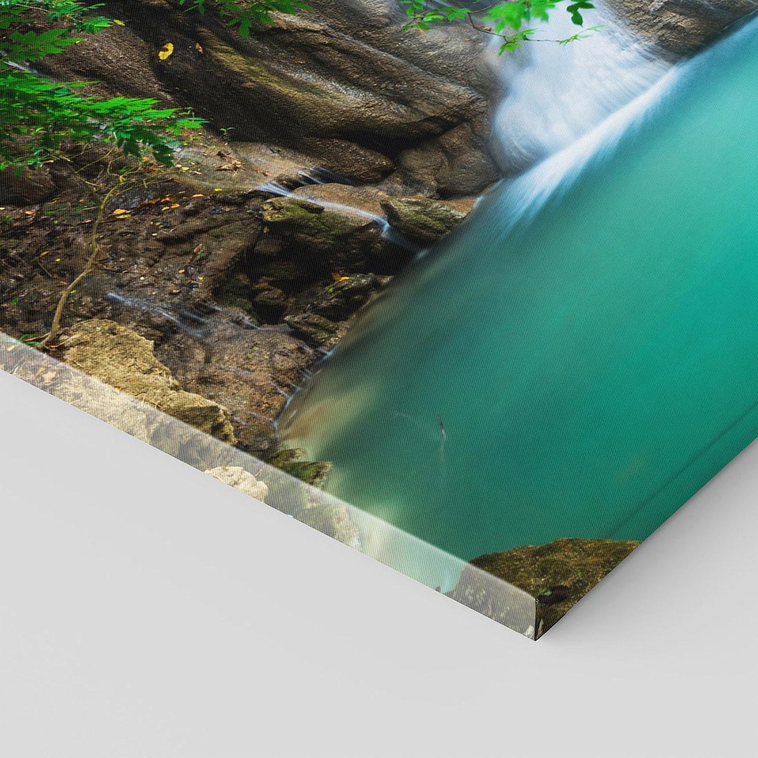 Odkryj piękno Tajlandii dzięki temu malowniczemu obrazowi przedstawiającemu wodospad w zielonym lesie. Błękitne niebo, soczysta roślinność i spływająca woda tworzą egzotyczną atmosferę. Ta kompozycja dodaje harmonii i tajemnicy, idealna dla miłośników przyrody i orientalnej egzotyki.