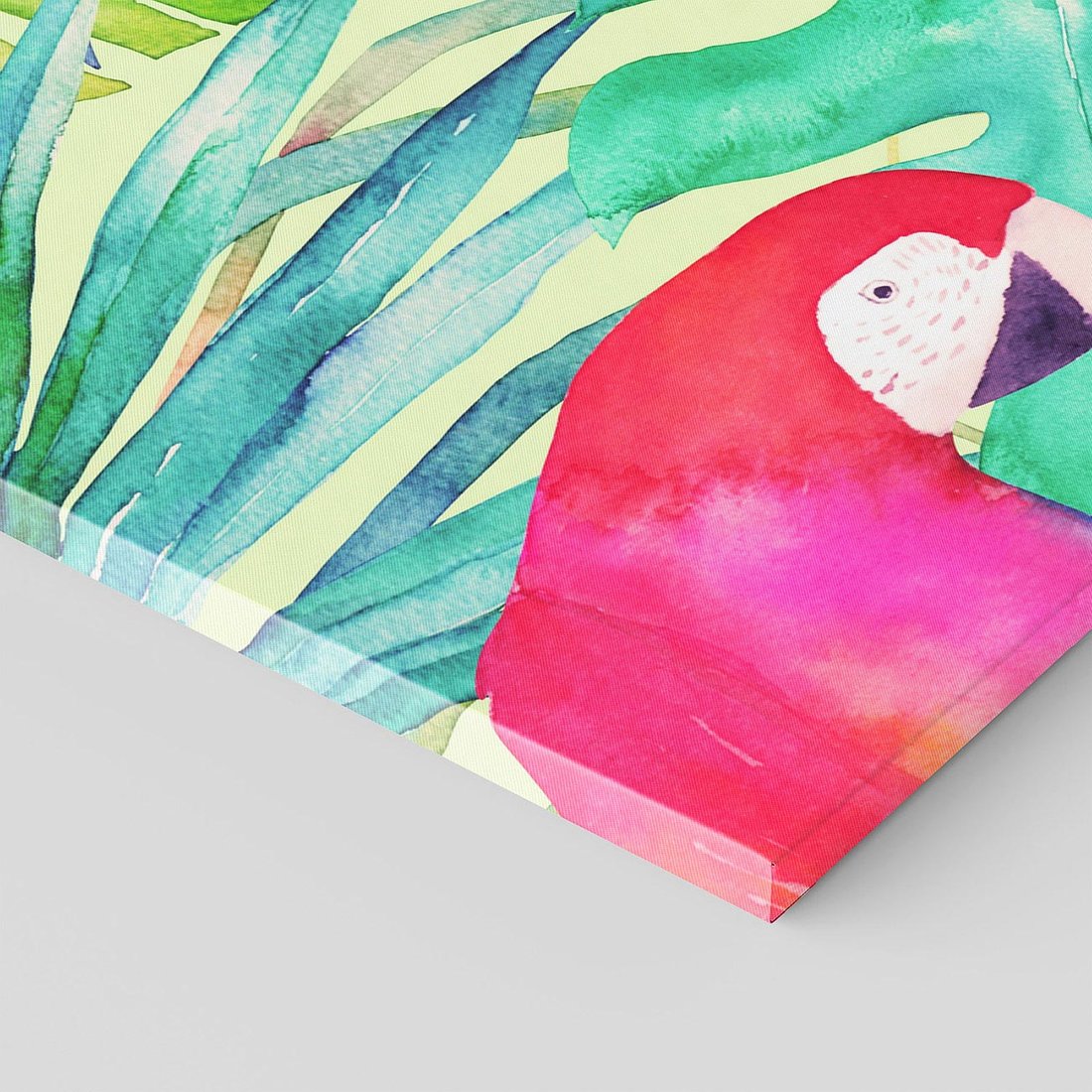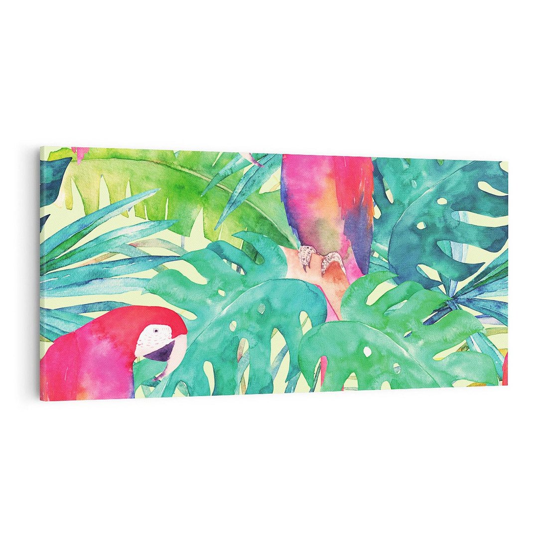 Ta egzotyczna kompozycja przedstawiająca tropikalne liście i papugi wprowadzi do Twojego wnętrza atmosferę egzotycznej przygody i kolorowego świata natury. Odkryj bogactwo kształtów i intensywność barw. Dodaj tropikalnego uroku i wyrazistości do swojego wnętrza.