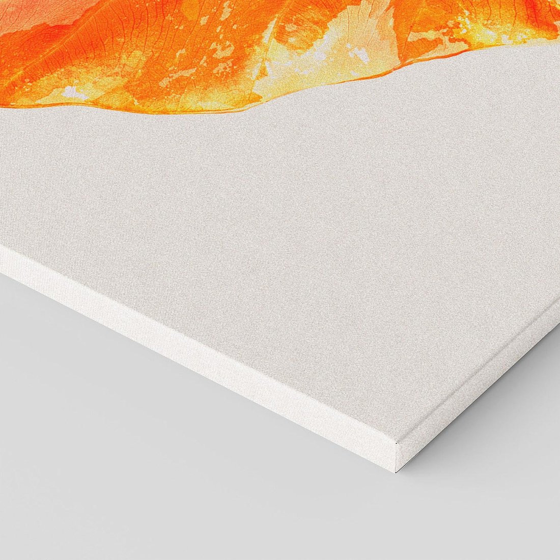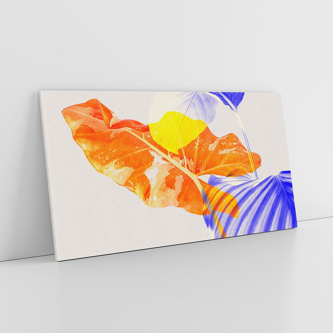 Obraz w stylu retro przedstawia tropikalne liście w energetycznych kolorach indygo i pomarańczu. Kompozycja emanuje radością i świeżością, przyciągając wzrok swoimi tropikalnymi motywami i wyrazistymi kolorami. Idealne dzieło sztuki, aby dodać wnętrzom wyjątkowej atmosfery i pozytywnej energii.