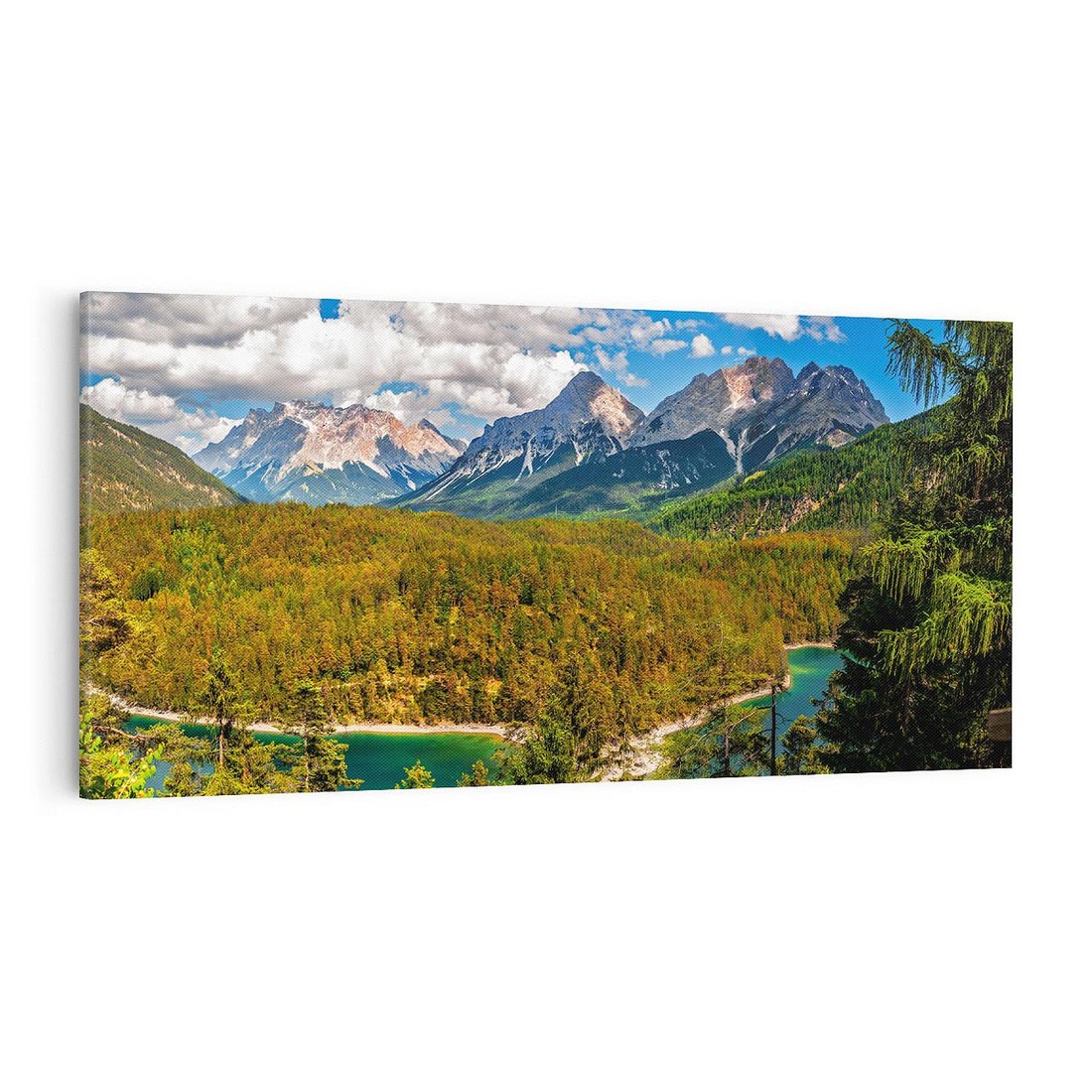 Odkryj harmonię górskiego krajobrazu dzięki temu obrazowi przedstawiającemu las i majestatyczne szczyty. Zielone drzewa, szumiące strumienie i malownicze góry tworzą niezwykłą atmosferę. Ta kompozycja dodaje spokoju i głębokiego podziwu dla natury, idealna dla miłośników górskich pejzaży i wyciszenia w otoczeniu przyrody.