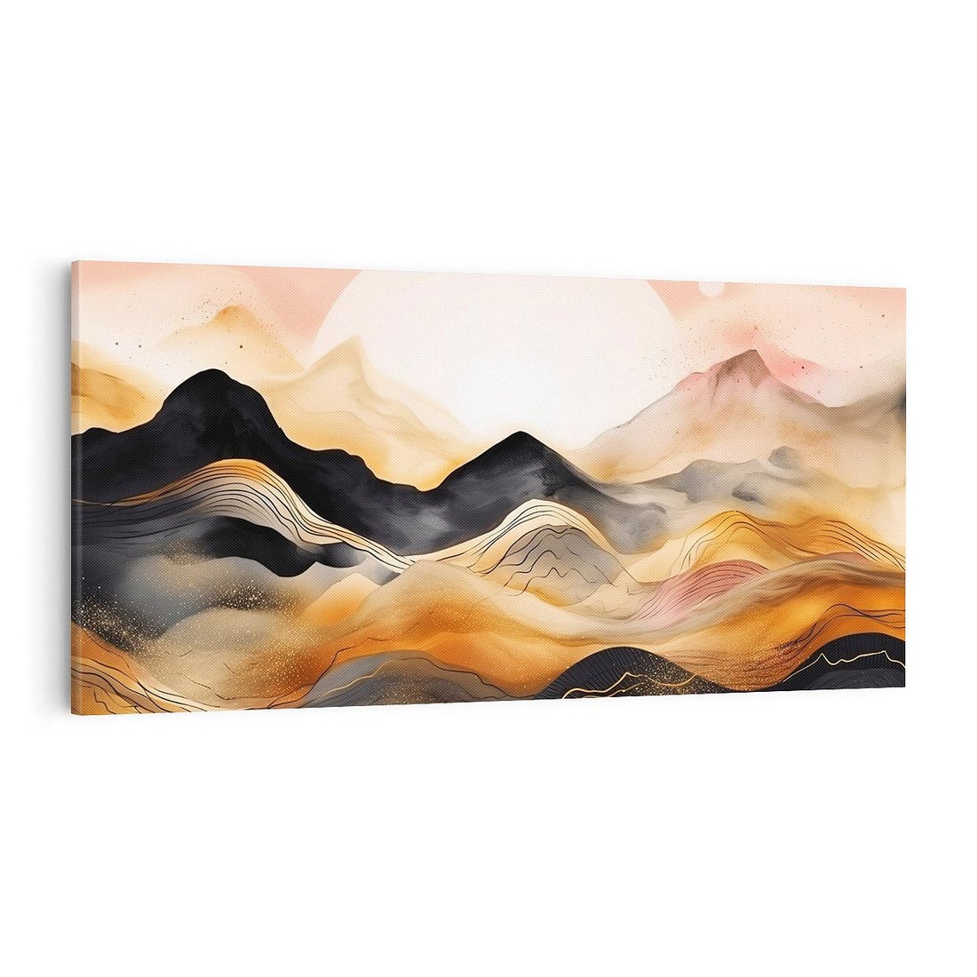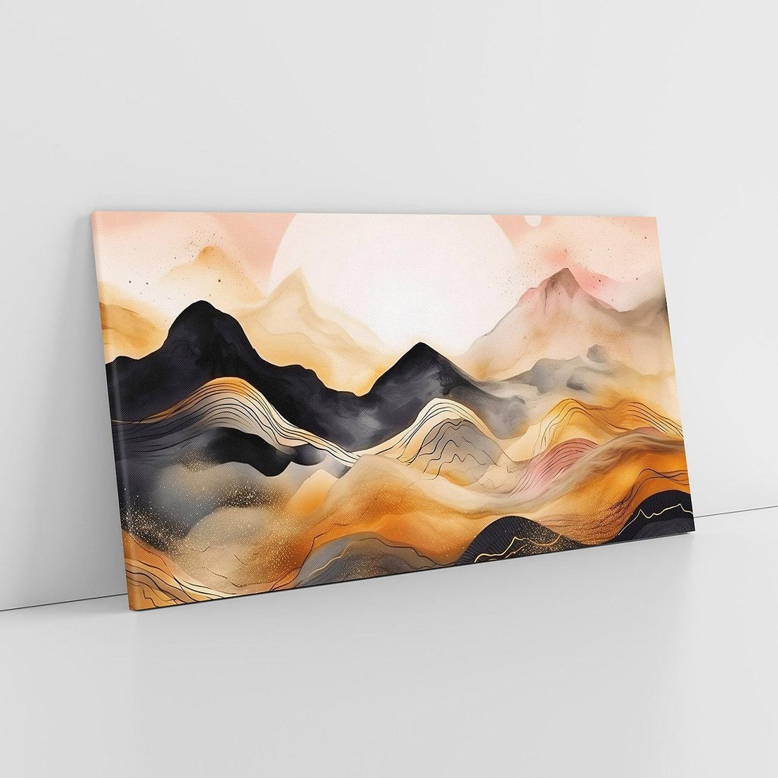 Ta nowoczesna grafika ukazuje urok zachodu słońca nad czarnymi górami. Odcienie pastelowego różu i złota tworzą magiczną atmosferę, przenosząc widza w malowniczy krajobraz. To artystyczne dzieło oddaje piękno natury i wprowadzi harmonię oraz ciepło do każdego wnętrza.