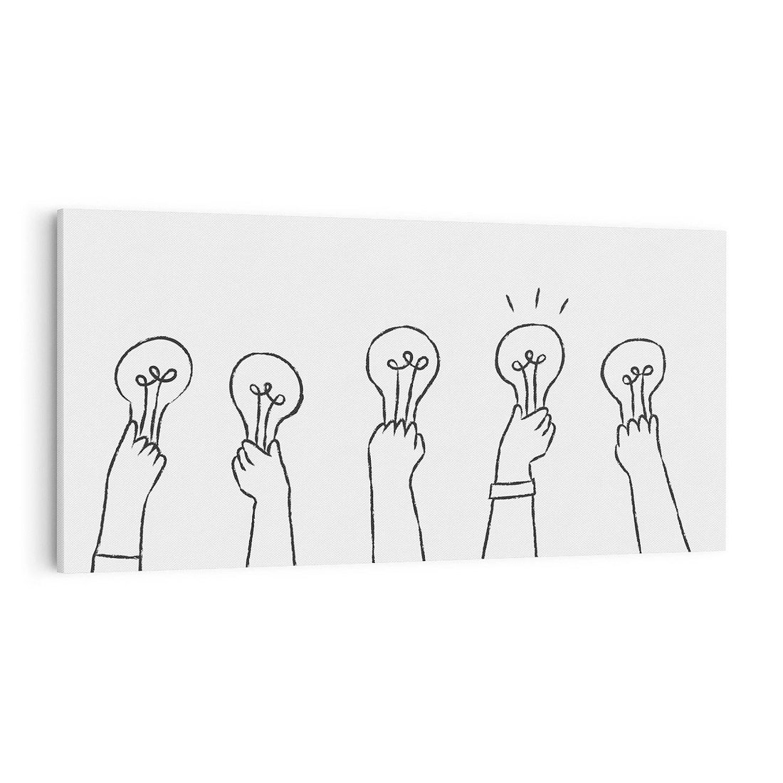 Ten biało-czarny szkic przedstawia koncepcję jako żarówki trzymane w dłoniach. To grafika, która symbolizuje twórczy pomysł i innowacyjną ideę. Prosty w formie, ale mocny w przekazie, obraz zachęca do refleksji nad potencjałem naszych myśli i kreatywności.