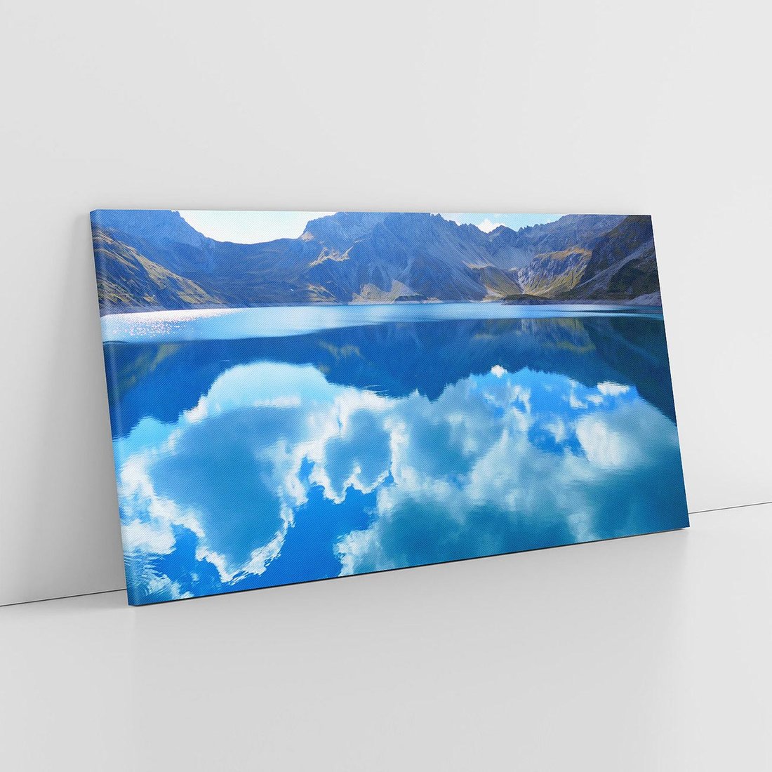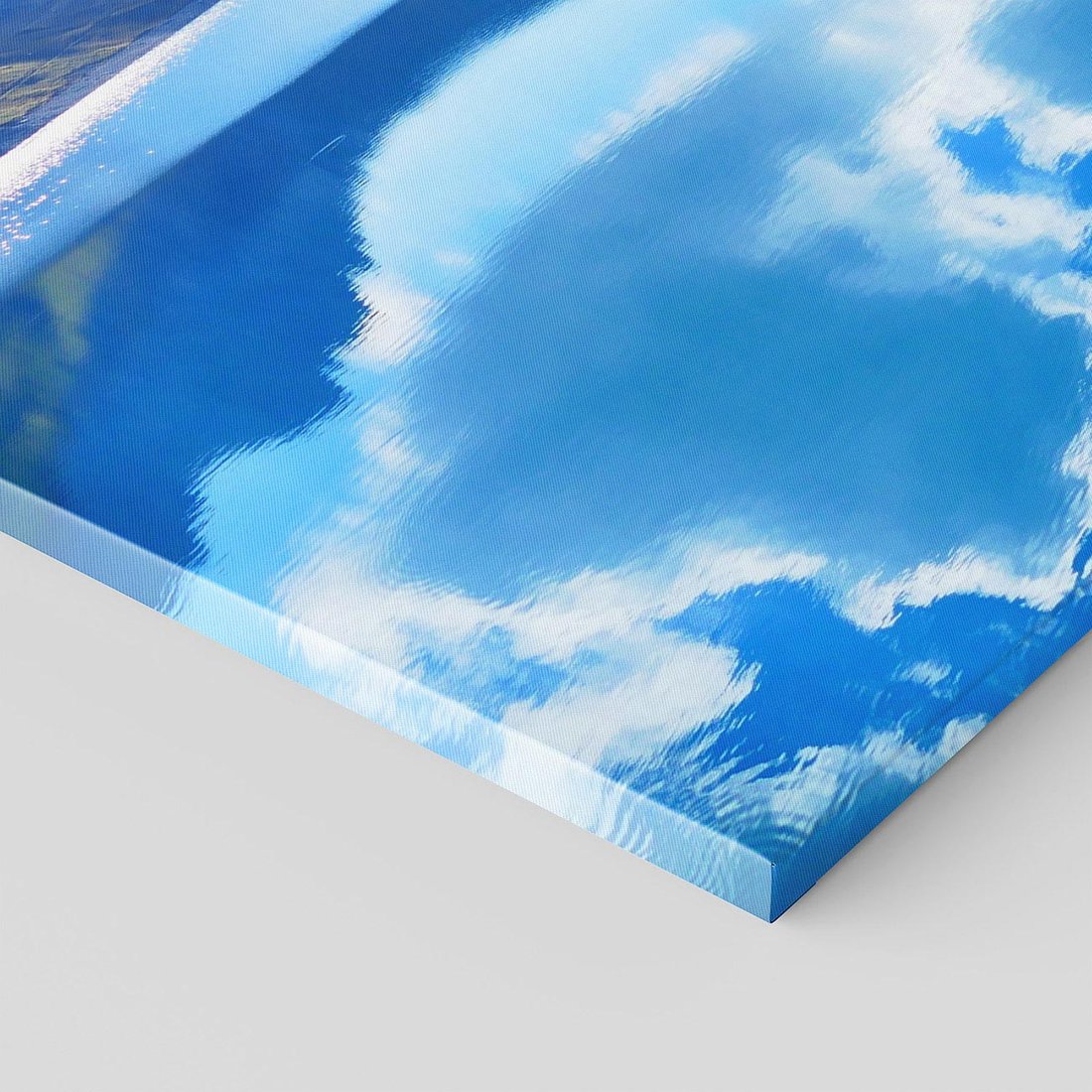 Ten ujmujący obraz przedstawia malownicze jezioro, otoczone majestatycznymi górami, unoszącymi się chmurami i niebem. Ciesz się widokiem harmonii natury i dodaj do swojego wnętrza nutę spokoju i piękna tym wyjątkowym dziełem sztuki.