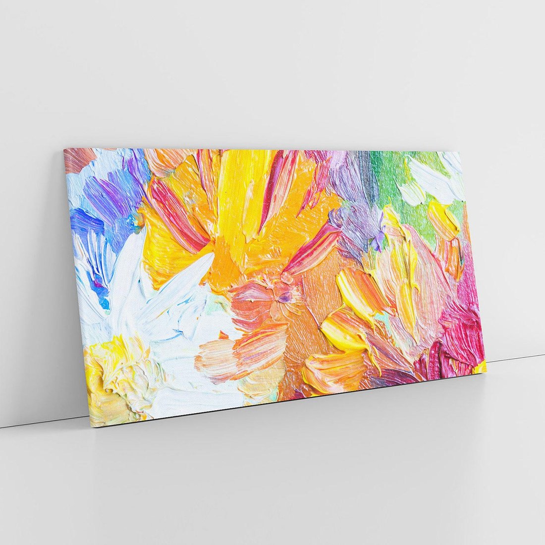 To dynamiczne zbliżenie na obraz olejny ukazuje malowane kwiaty o żywych, tęczowych kolorach. Gruba warstwa farby nadaje kompozycji teksturę i głębię. "Kwiatowe Harmonie" to eksplozja optymizmu i radości, gdzie artysta przenosi widza w magiczny świat pełen barw i życia, celebrując piękno natury.