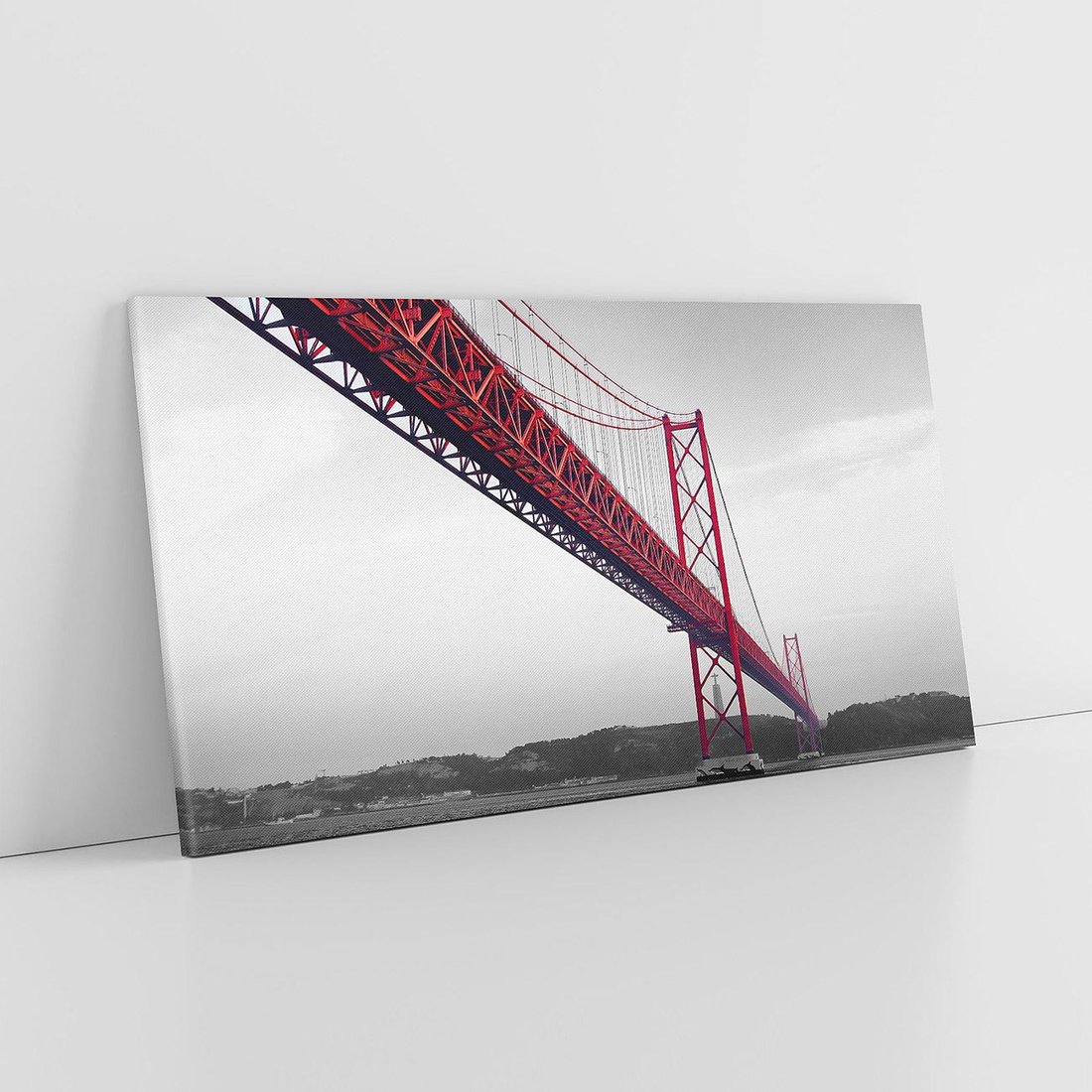 Ta czarno-biała fotografia ukazuje majestatyczny obraz czerwonego, stalowego mostu rozpostartego ponad rzeką. Jego imponujący i ogromny kształt kontrastuje z delikatnymi odcieniami szarości wokół, dodając mu siły i wyrazu. Widok ten zachwyca swoją potęgą i elegancją, oddając ducha architektury w harmonii z naturą.