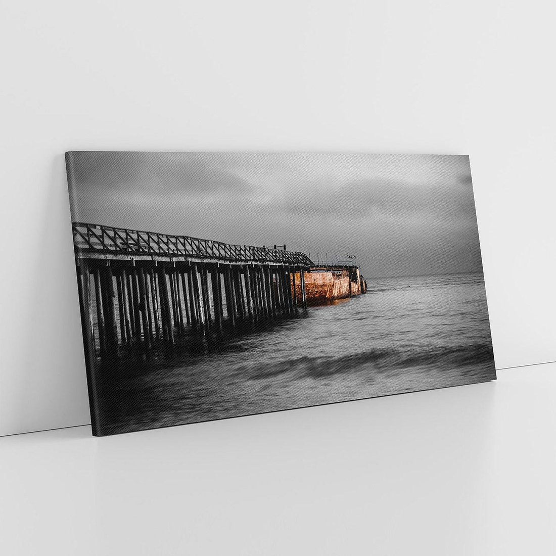 Ten tajemniczy obraz przedstawia molo, gdzie w oddali można dostrzec wrak statku na plaży. Przenieś się w świat tajemnic i historii, dodając nutę morskiego klimatu do swojego wnętrza tym wyjątkowym dziełem sztuki.