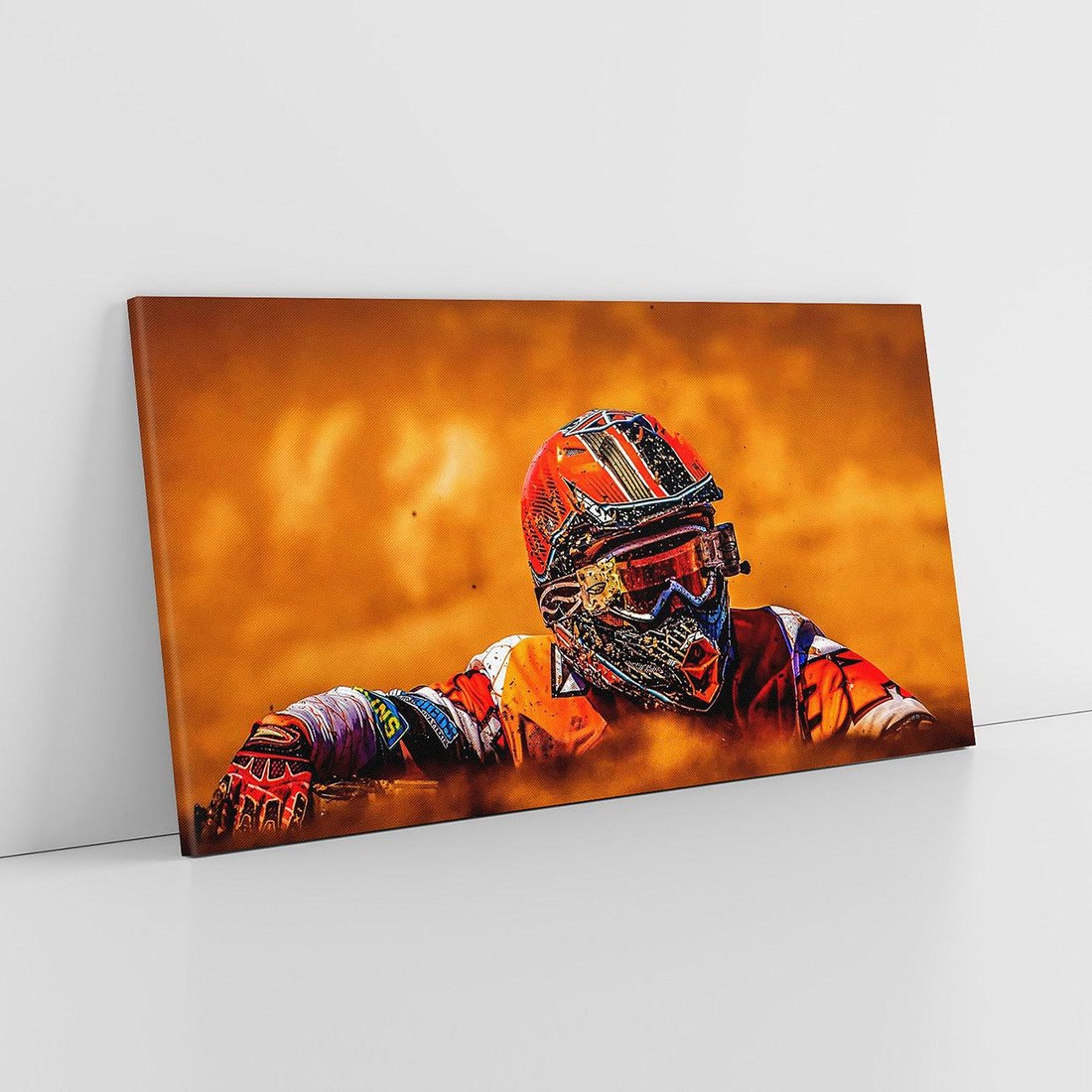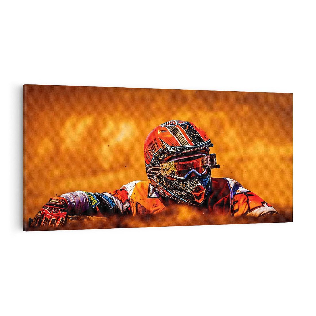 To malarskie dzieło oddaje szybkość i ekscytację wyścigów motocyklowych. Motocyklista w pełnej kasku przemierza tor, podążając za zwycięstwem. To sport, który zapiera dech w piersiach i wymaga doskonałej techniki jazdy. Wprowadź do swojego wnętrza atmosferę adrenaliny i pasji motocyklowych zmagań.