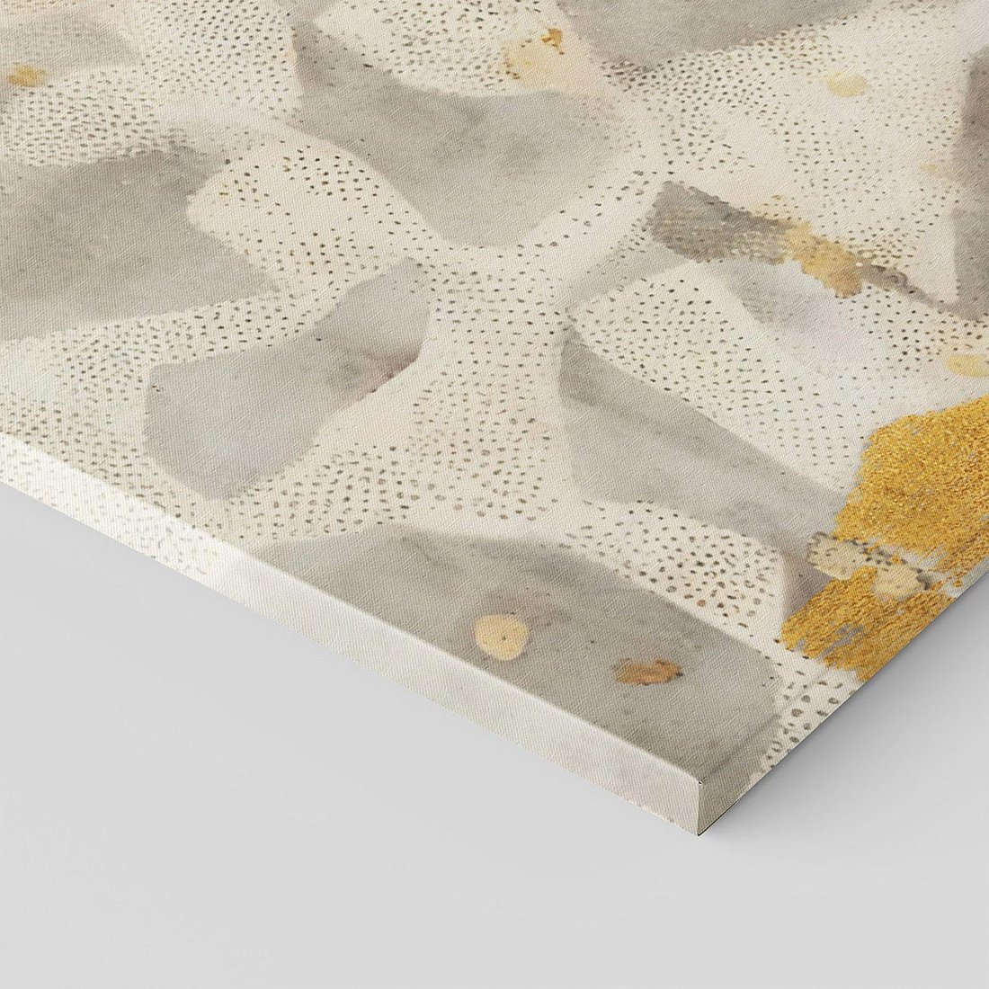 Ten nowoczesny obraz o charakterze glamour przedstawia złote i beżowe plamy, tworząc abstrakcyjne formy. Szarość dodaje elegancji i głębi kompozycji. To wyjątkowe dzieło sztuki idealnie pasuje do nowoczesnych wnętrz, nadając im subtelny luksus i artystyczną atmosferę.