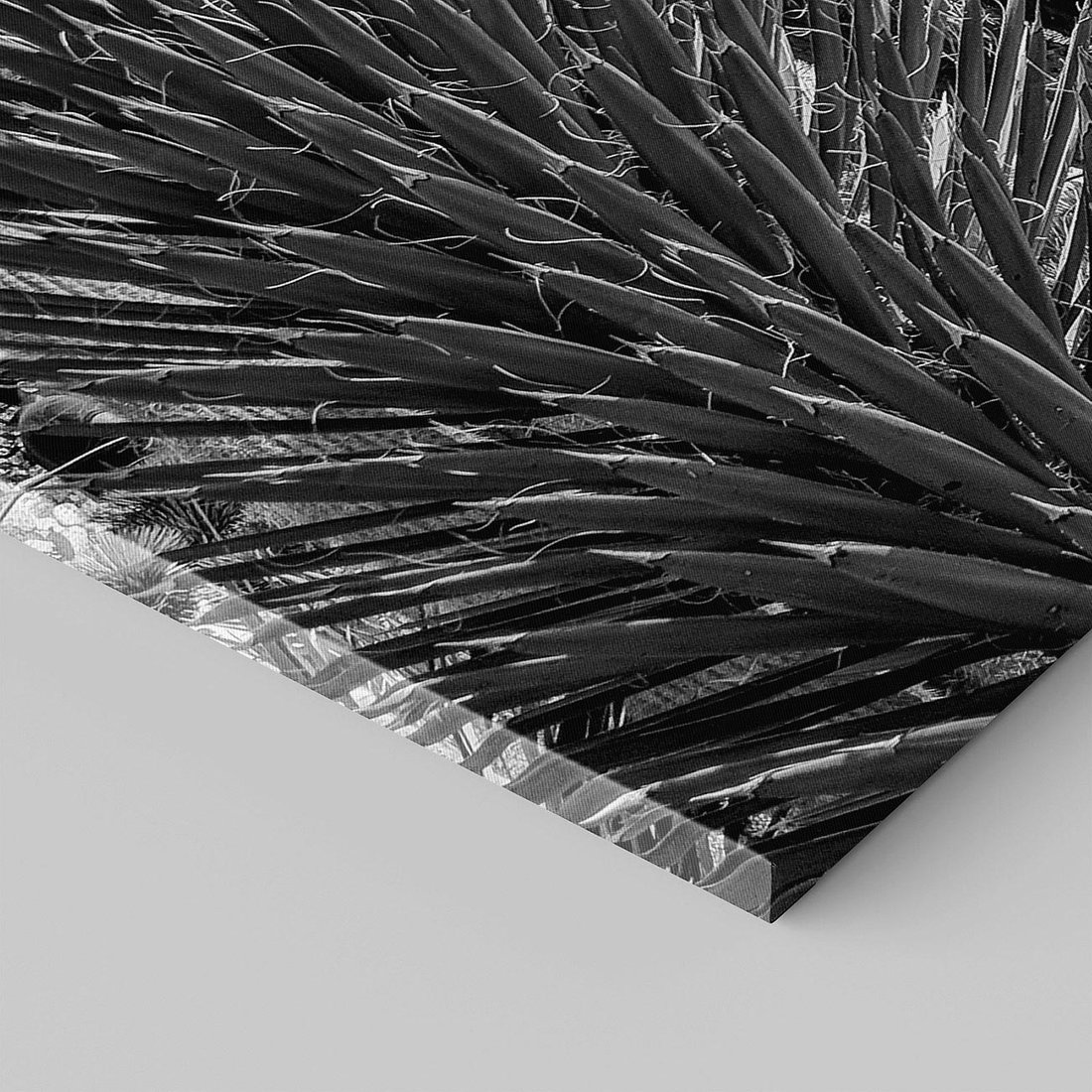 To czarno-białe zdjęcie ukazuje surową piękność pustyni, gdzie wydźwięk kontrastujących odcieni czerni i bieli podkreśla jej dzikość i spokój jednocześnie. Kaktusy, rosnące w tej niegościnnej przestrzeni, dodają kompozycji życia i symbolizują wytrwałość w trudnych warunkach. To zdjęcie emanuje spokojem i samotnością pustyni, co czyni je idealnym dodatkiem do minimalistycznych wnętrz, podkreślając urok prostoty i natury.