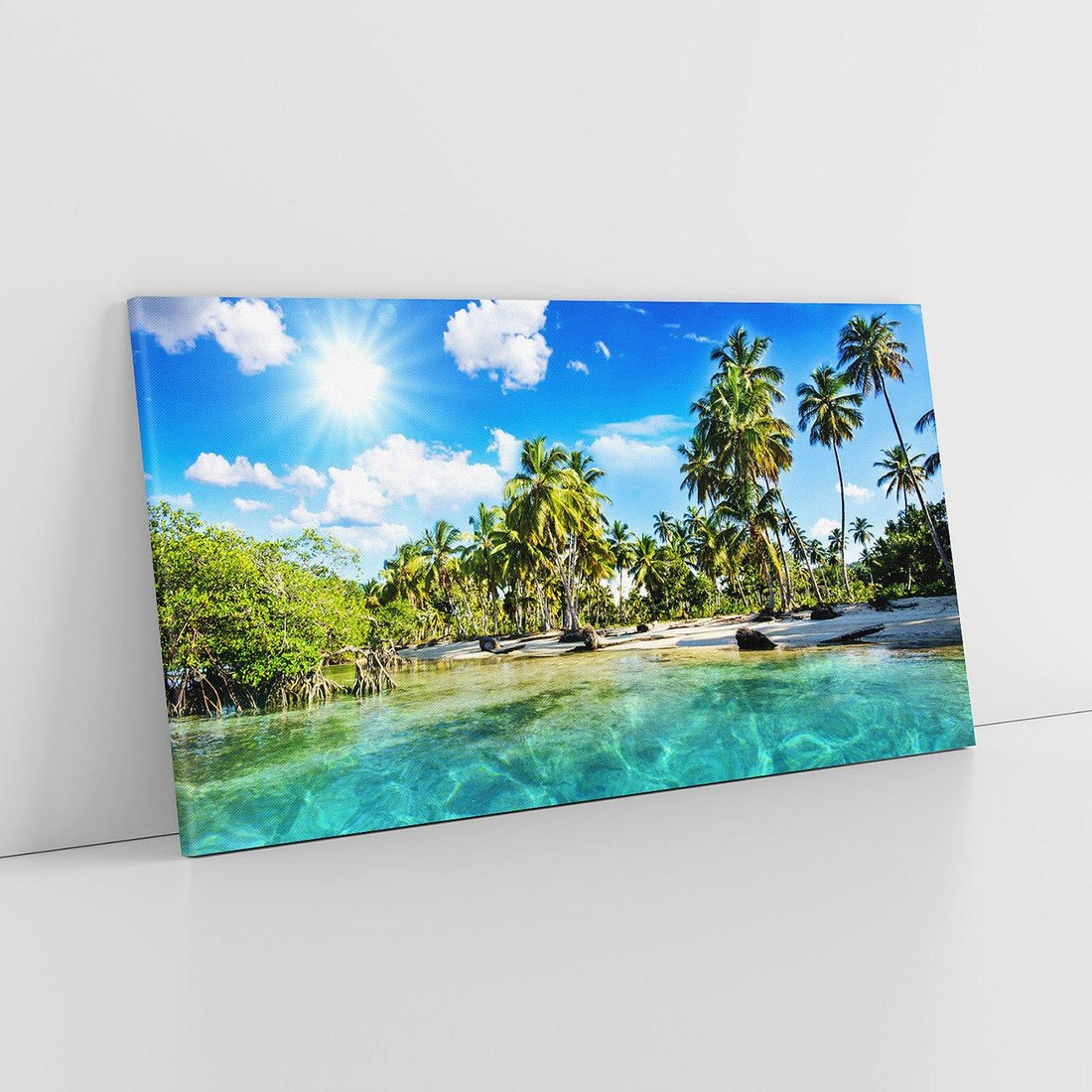 Przenieś się na rajską plażę, gdzie palmy kołyszą się na wietrze, a błękitne fale zapraszają do relaksu i wakacyjnej beztroski. Ta malownicza kompozycja przywołuje atmosferę sielskich chwil spędzonych na egzotycznej plaży.