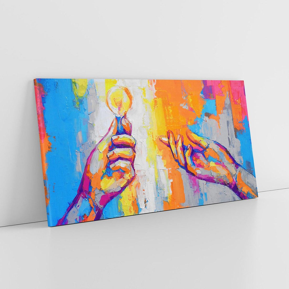 To abstrakcyjne dzieło ukazuje dłoń trzymającą żarówkę, symbolizującą pomysł i inspirację. Nieoczywiste kolory, głównie żółć i niebieski, podkreślają niezwykłość i wyjątkowość tej idei. Całość kompozycji emanuje kreatywnością i wizją, zachęcając widza do odkrywania nowych horyzontów. To malarskie arcydzieło przypomina nam, jak ważne jest odkrywanie nieznanych obszarów umysłu, by odnaleźć wyjątkowe rozwiązania.