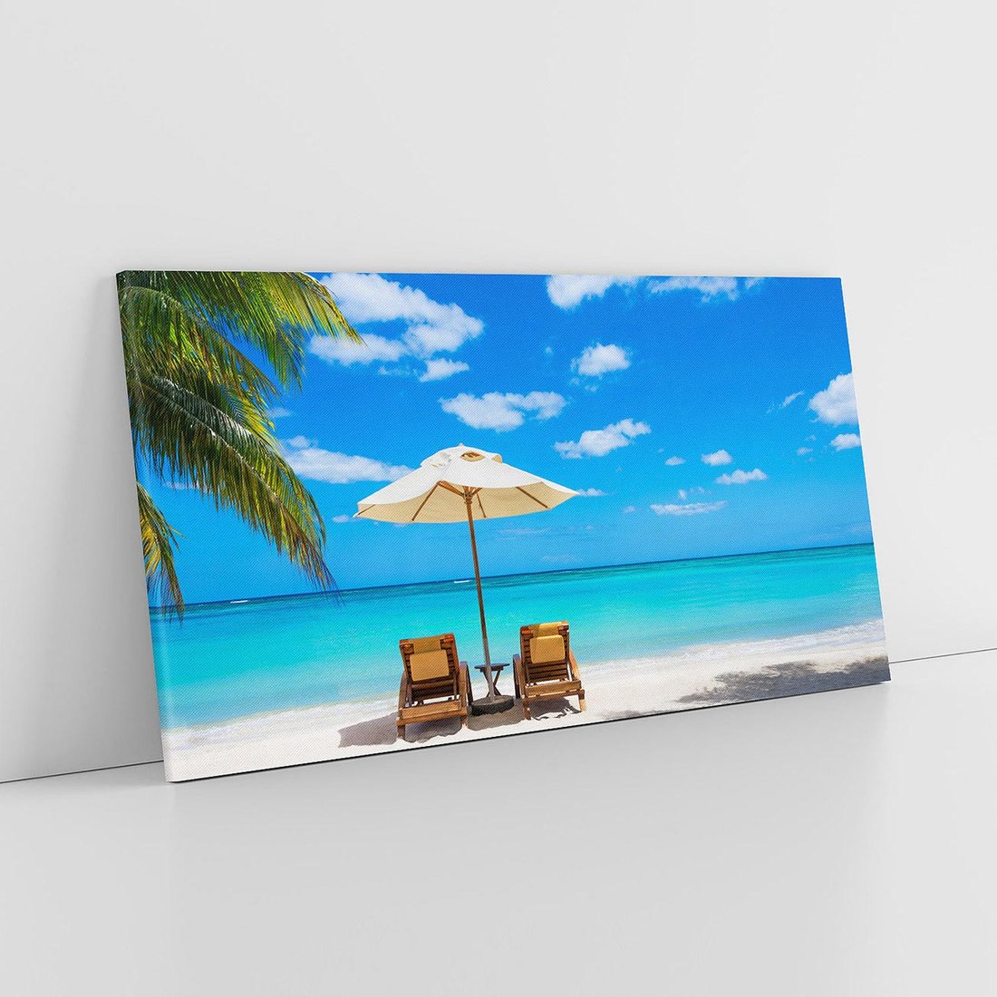 Przenieś się na egzotyczną plażę dzięki temu ujmującemu obrazowi na płótnie. Palma i kolorowe parasole nadają tropikalny klimat, a piasek i turkusowa woda dodają spokoju i świeżości. Dodaj odrobinę raju do swojego wnętrza.