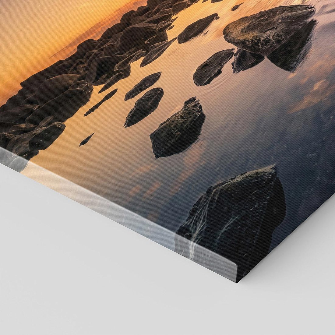 Ten ujmujący obraz ukazuje malowniczy zachód słońca nad jeziorem. Jego odcienie i odbicie na spokojnej tafli wody tworzą atmosferę spokoju i harmonii. To dzieło sztuki wprowadzi do Twojego wnętrza wyciszenie i relaks, pozwoli odpocząć od zgiełku codzienności.